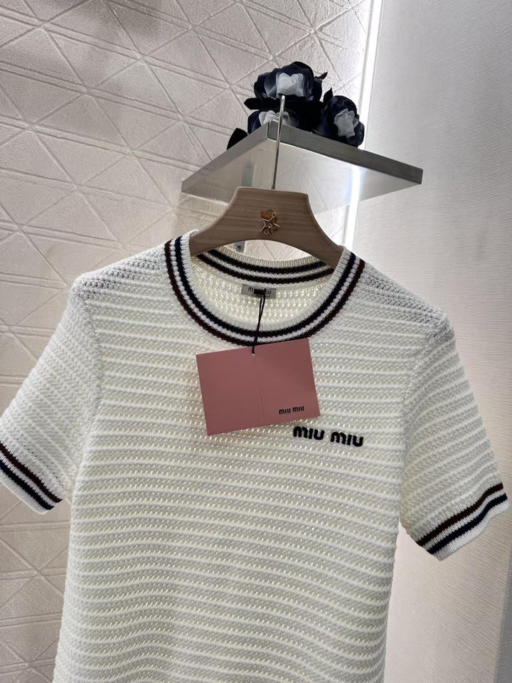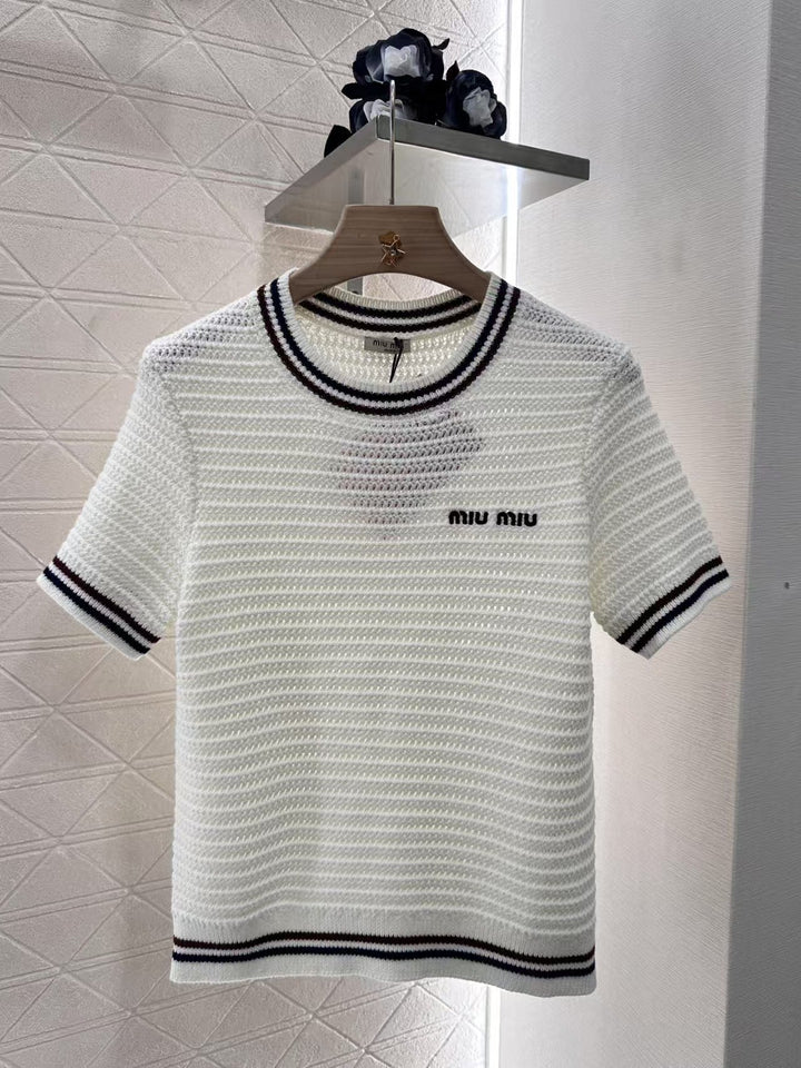 , high-quality texture, breathable and comfortable Knitted round neck top cut The whole body uses hollow crochet texture to interweave and outline the striped line pattern to highlight the high-end sense of wear. The neckline, cuffs and hem use blue and red thread contrasting colors. The elasticity is more exquisite. The wear is slimming. The version is inclusive of the body and shows the relaxed tone. The contrasting embroidered logo on the chest highlights the light luxury and fashionable temperament. It can be worn alone or layered. The first choice for fashionable wear in all seasons