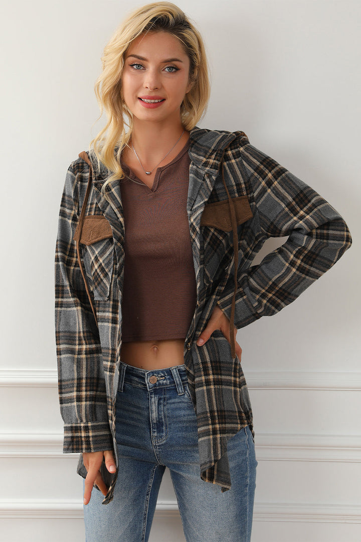 Hooded flannel with front pockets and drawstring hood. Pair with a cute bodysuit and some jeans to elevate that perfect outfit. In this year's warm trendy colors.