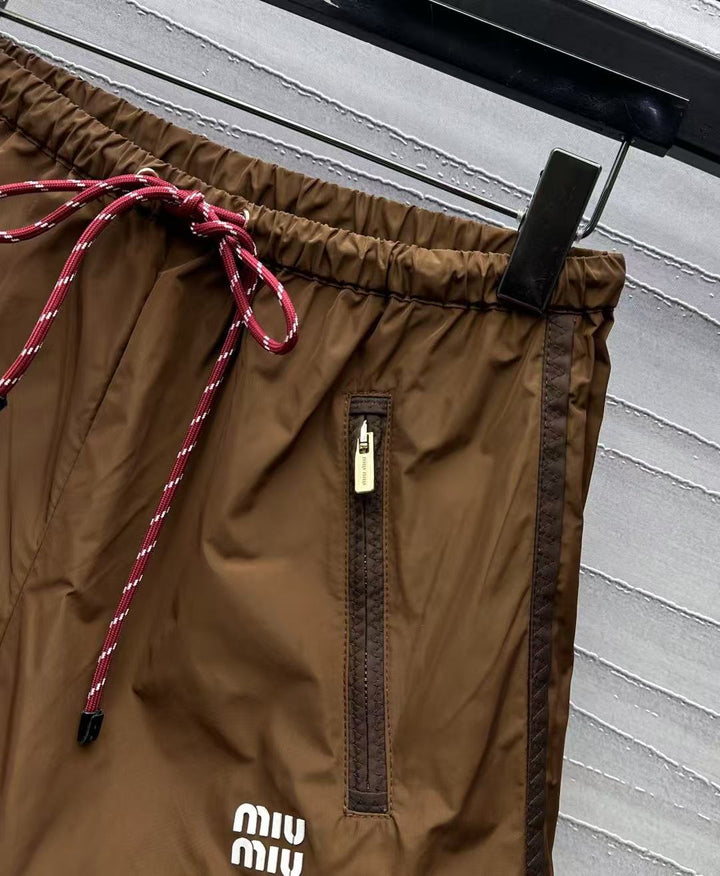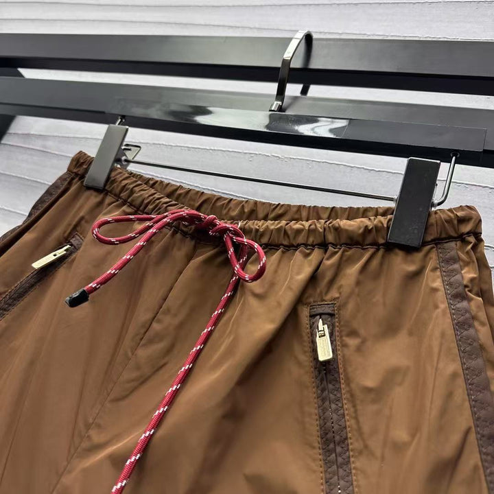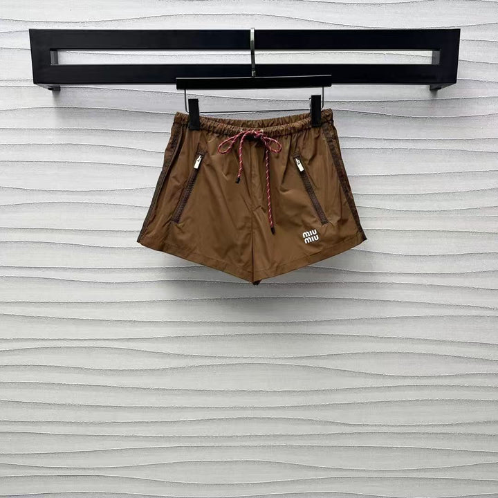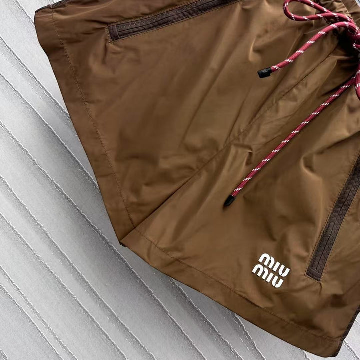 Nylon drawstring customization Imported thin nylon material breathable, comfortable and stylish Decorated with letter logo on the hem to highlight the brand tone Elastic waistband with contrasting color drawstring embellishment to add layering to the shape High waist A-line tailoring Can be matched with the same series to make a set look stylish and age-reducing Series development Choose to buy at will