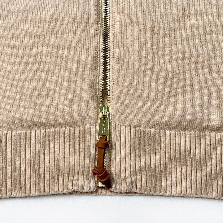 A new long-sleeved zipper jacket for autumn and winter, knitted with custom-dyed cashmere yarn, with custom hardware zipper + leather cord decoration, exquisite and durable, looks good whether worn alone or layered. The elegance and high-end sense of a celebrity girl are fully displayed on this jacket! It is recommended to match it with pants of the same color.