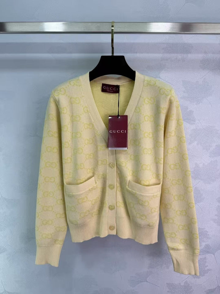 New 2025 Spring and Summer Collection! Jacquard logo knitted cardigan! Custom wool knitted material, delicate and soft, breathable and comfortable, with full marks for threaded edge details, decorated with contrasting diamond patterns and double G patterns throughout, with a strong retro style, retro and age-reducing, whitening, easy to wear for daily travel or casual gatherings!