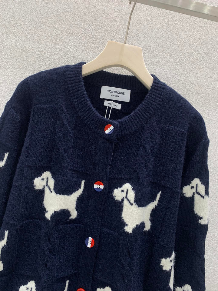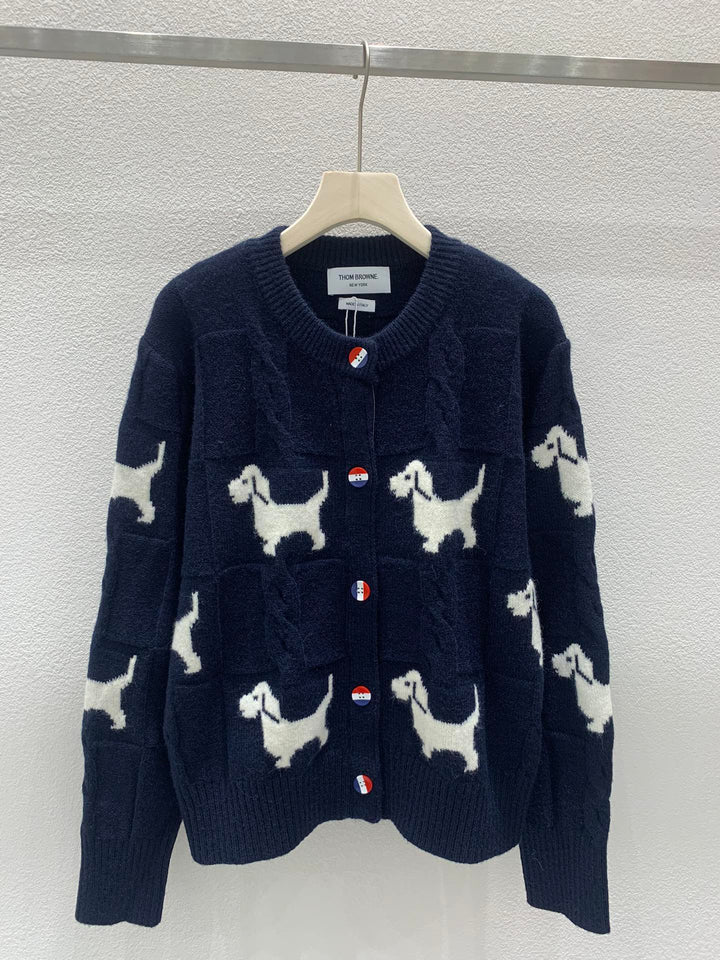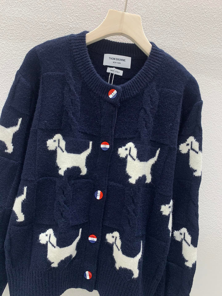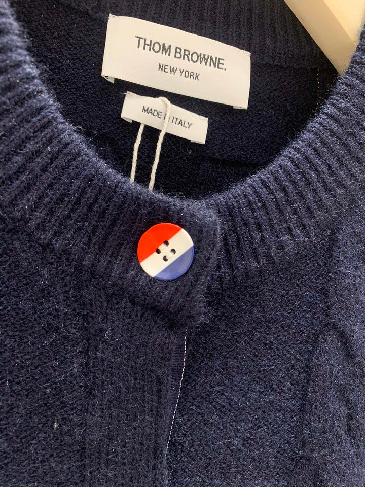 Knitted contrast color round neck cardigan 🆕 Contrast color stripe stitching design Two pockets decorated with logo buttons Cuffs and collar braided edging design Fashionable and versatile Size sml