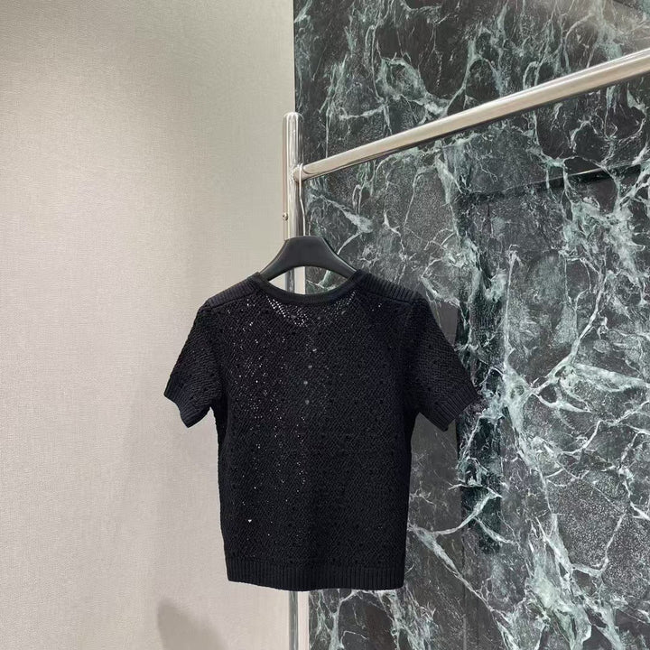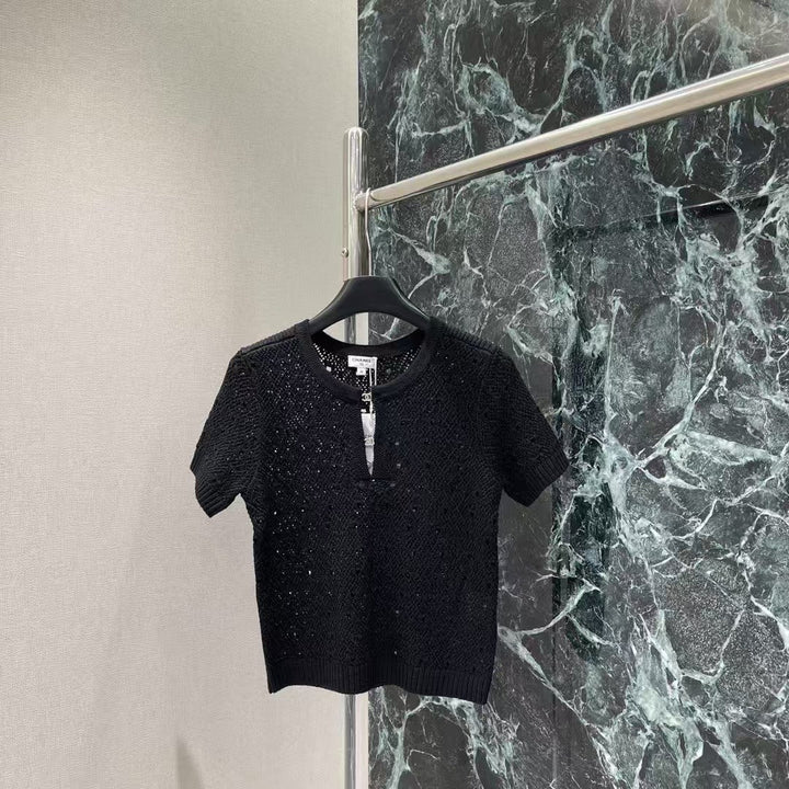 25 new summer styles Knitted hollow short sleeves Hollowed out and slightly transparent The front gold half-open careful design + double C hardware nail diamond logo highlights the highlights and shows the brand tone. The versatile style is not picky about age and skin color. The upper body is suitable for a fashionable style that reduces age.