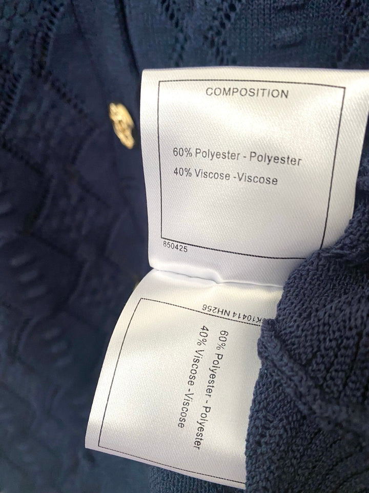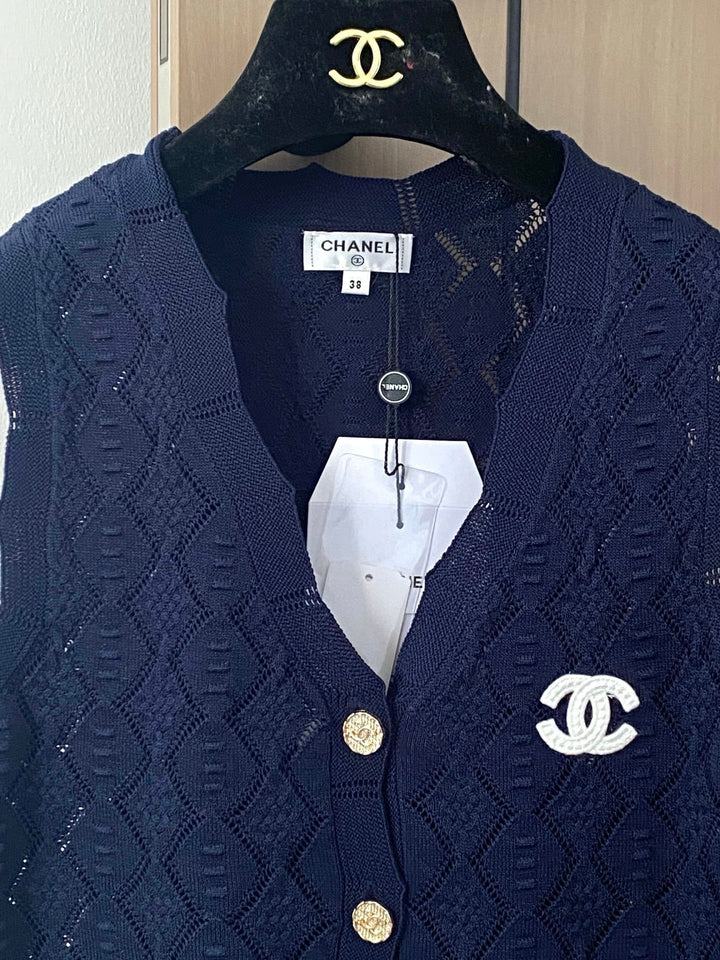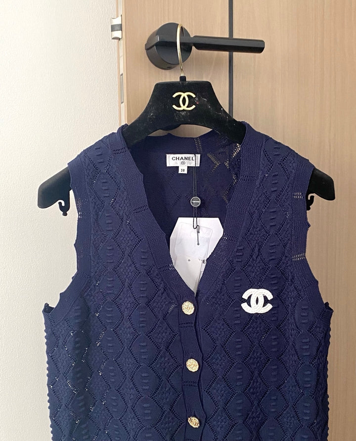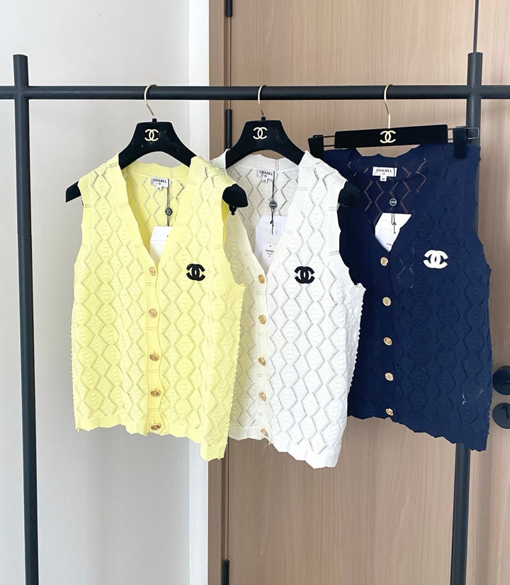 250628 style knitted vest in three colors: yellow, white and dark blue. Hollow diamond pattern design. Logo embellishment on the chest. Gold button decoration. Comfortable and breathable fabric.