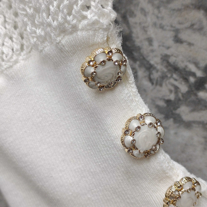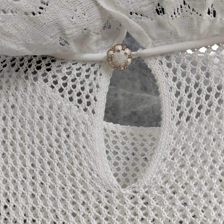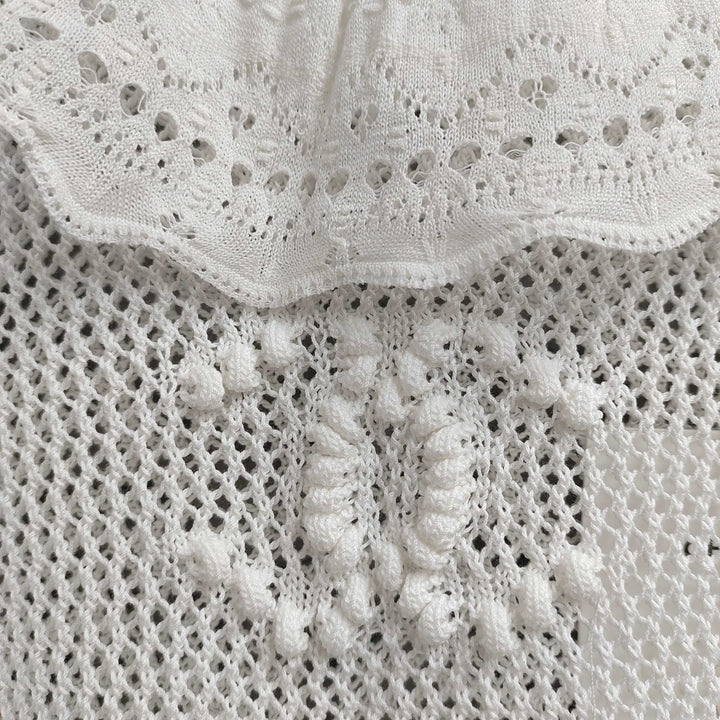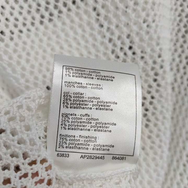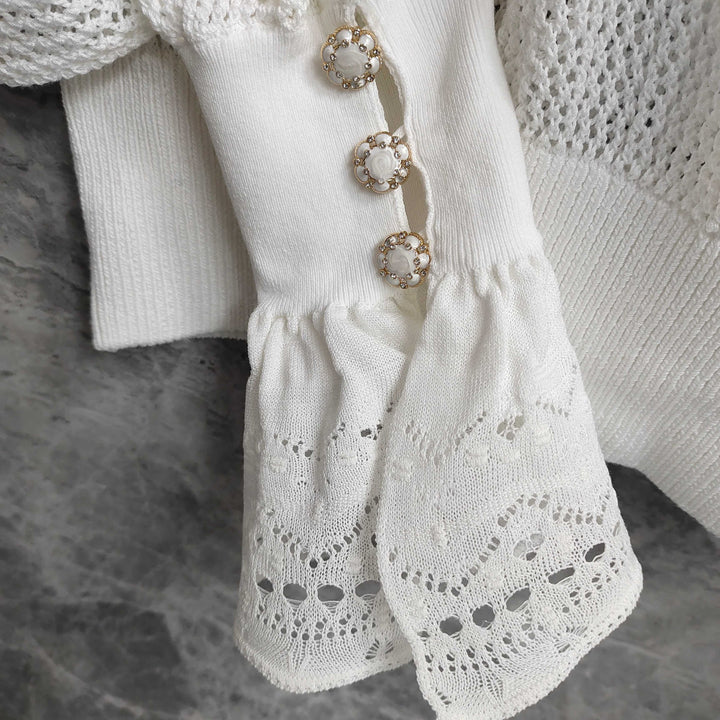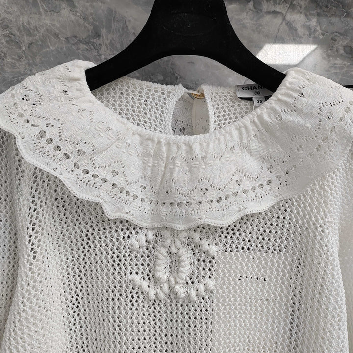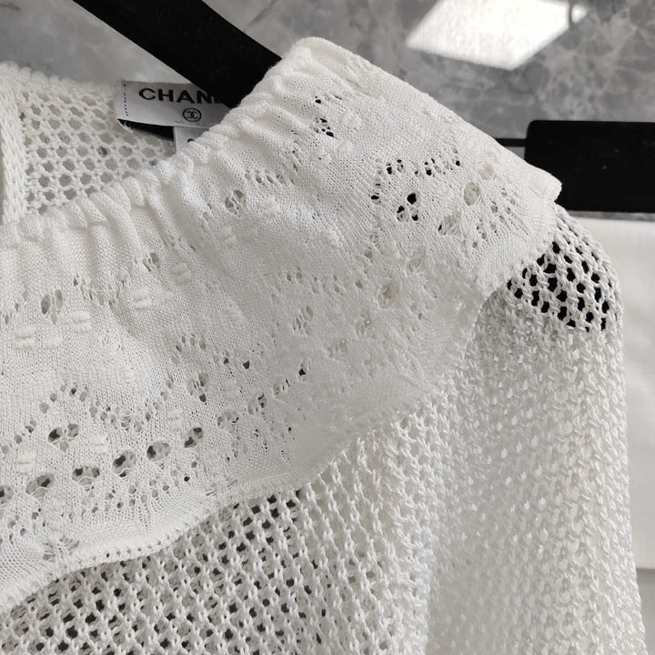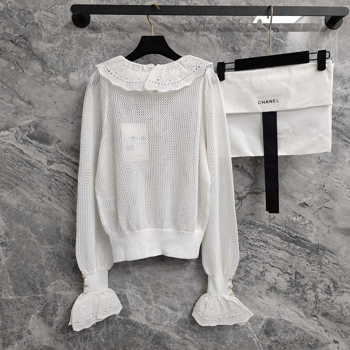 A hot item, exclusive and first-time release. Custom-made, stacked lace-collared, hollowed-out sweater made with imported YB yarn for a premium, comfortable, and soft look. The round neckline and long sleeves feature lace trimmings at the neckline, creating a stacked collar and flared cuffs that complement the aristocratic look, adding a slimming and feminine touch. The all-over hollow knit is stylish and sexy. The 3D double-C logo on the chest echoes the cufflinks, highlighting its premium positioning and fashionable tone. The regular fit creates a gentle, tranquil, and refined style.