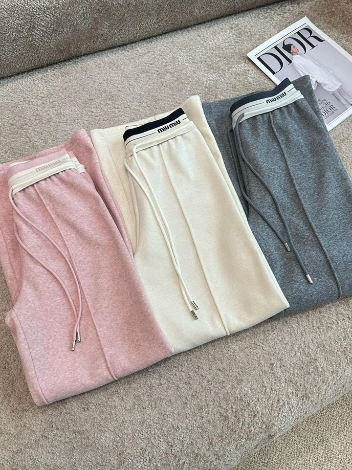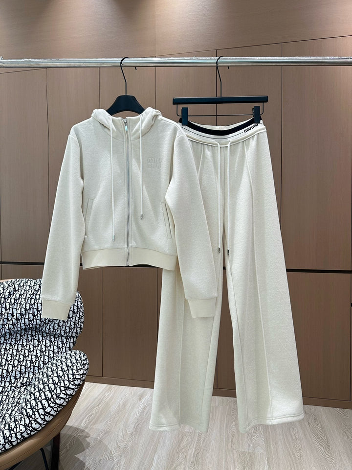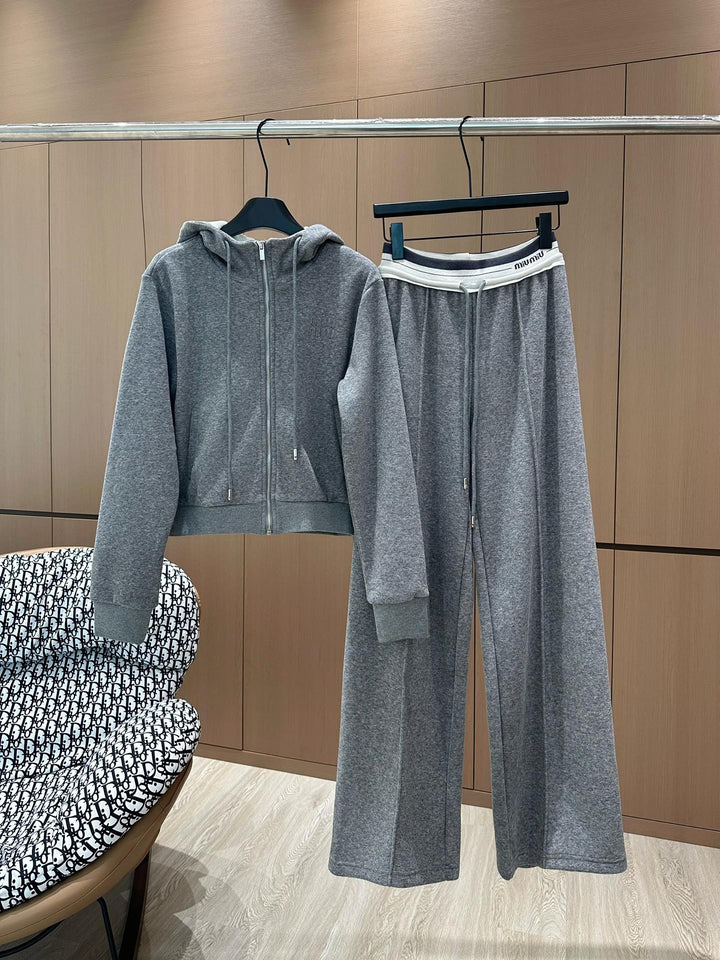 Winter heavy-duty letter embroidered long-sleeved zipper hooded jacket + high-waist elastic waist drawstring casual wide-leg pants two-piece set