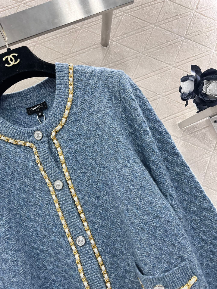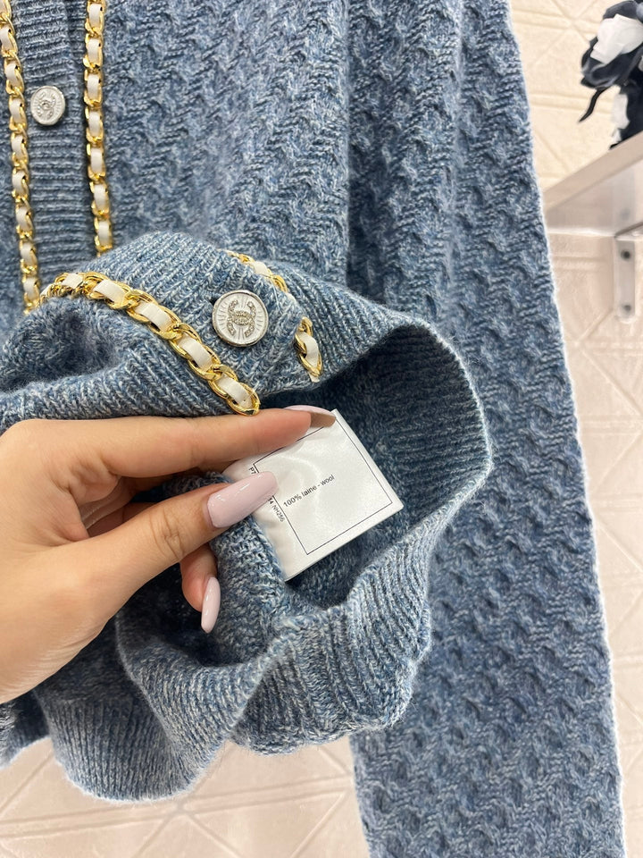 Customized wool knitted material, comfortable and soft Classic ribbed V-neck Leather chain decoration on the collar and cuffs Double C engraved collar buttons echo the double side pockets to reflect the charm of temperament The ready-made hook flower craftsmanship is decorated with twisted rope shape to enrich the visual embellishment Slightly slim fit Cutting is smooth and comfortable Finely adjusted shortened length to optimize body shape Easy to have a good proportion Elegant temperament Customized fabrics and accessories