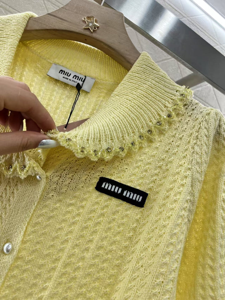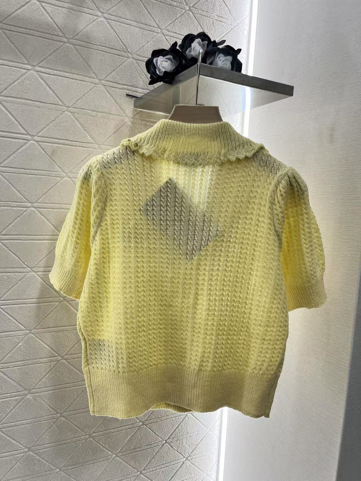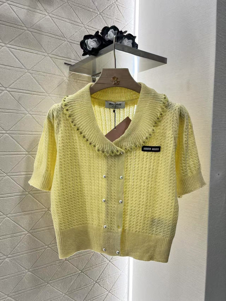 Lapel short-sleeved knitted cardigan Customized YB wool yarn woven Delicate texture, soft and comfortable Lapel short-sleeved knitted cardigan cut Double-breasted design on the front Rhinestones and pearls extending from the collar edge add a fashionable tone Slightly puffed sleeves created by the pleats of the sleeves show a romantic princess style The elastic fabric throughout the body modifies the body shape and makes you look slimmer The classic letter logo decoration on the chest shows the brand tone Versatile style regardless of age and skin color The upper body is suitable for a fashionable and retro style that reduces age.