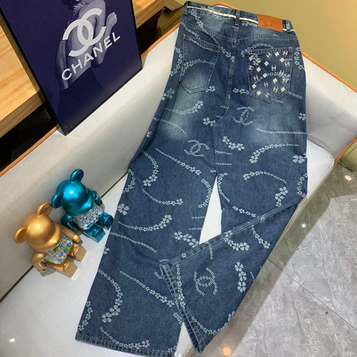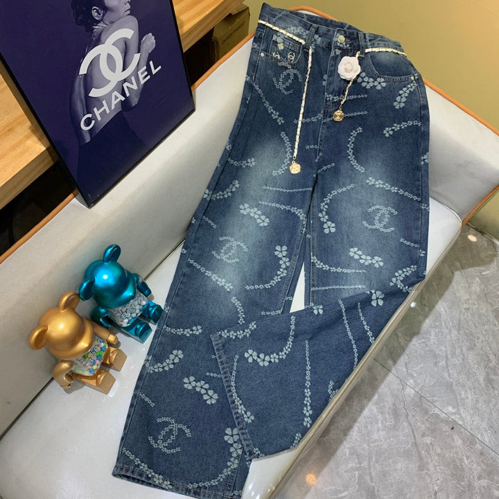New for fall and winter, these high-waisted, wide-leg straight-leg jeans are made with a two-tone, all-over jacquard logo! Made with custom-made fabrics, these jeans are a must-have for every woman. These slimming wide-leg jeans are incredibly flattering! Made with a high-weave organic cotton denim with a soft, smooth texture! The nostalgic, retro wash offers a trendy, sophisticated look! The waistband and cuffs, along with the all-over jacquard logo print, create a stylish design that's incredibly flattering! The custom fit is incredibly flattering!
