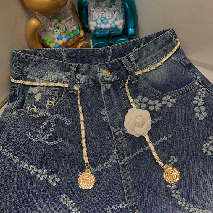 Laser pocket embroidered jeans are full of design and look great with chains.