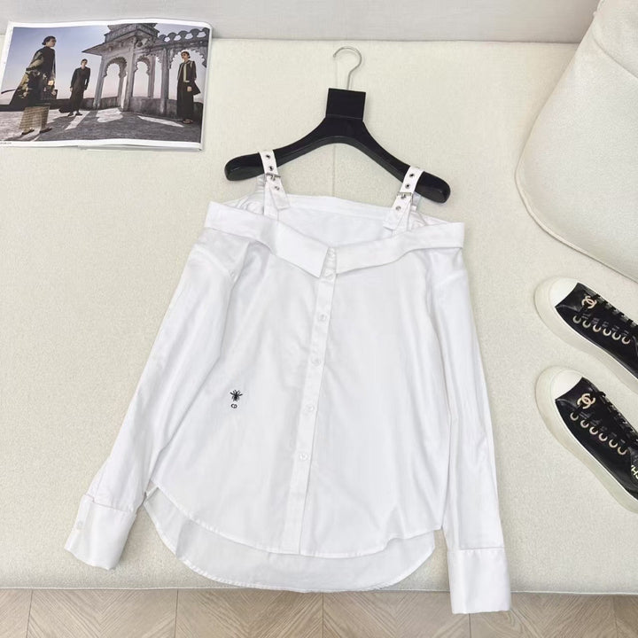 The latest spring and summer long-sleeved shirt with one-line collar design 🖤French elegance and casualness, you can create various styles at will, sweet or salty, white and rich temperament, super age-reducing artifact, loose version, three-dimensional tailoring, this season's must-have versatile item, imported cotton poplin pure cotton shirt fabric