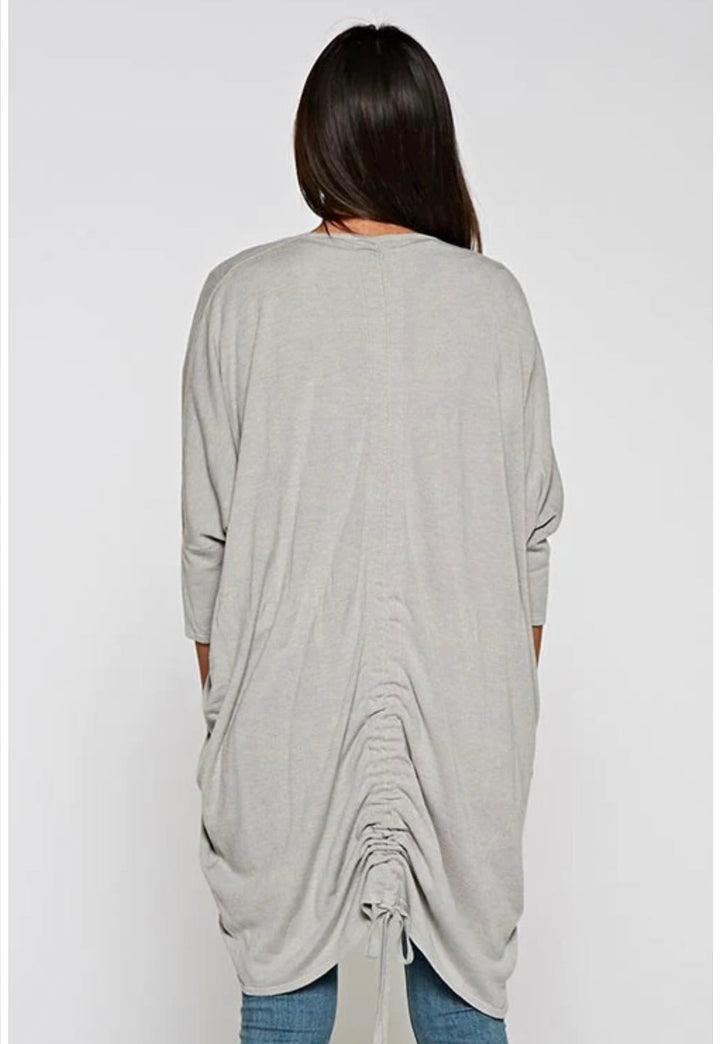 Luxurious high end cardigan. Super soft 3/4 sleeve with scrunch back for a custom look. Beautiful soft gray color pairs perfectly with any color and style outfit.