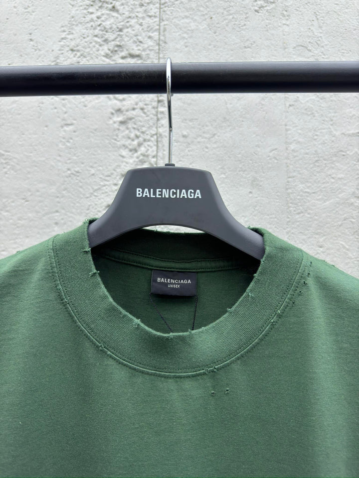 The sleeves and hem are treated with a frayed effect. The lining is clean and has no ends. The shoulders are frayed. The shoulders are stitched with straight three-needle and five-thread craftsmanship. The inner lining of the shoulders is taped. The fabric is made of distressed washed brushing. The collar is frayed and hole-designed ribbing. The fabric is custom-woven and dyed with consistent color and no color difference. Masking paper tape is used on the chest to process the letters. The process of overall weighting is washed. The fabric is comfortable, soft and wear-resistant. The letters on the back are manually aligned and shaped with a hot plate and glue printing process.