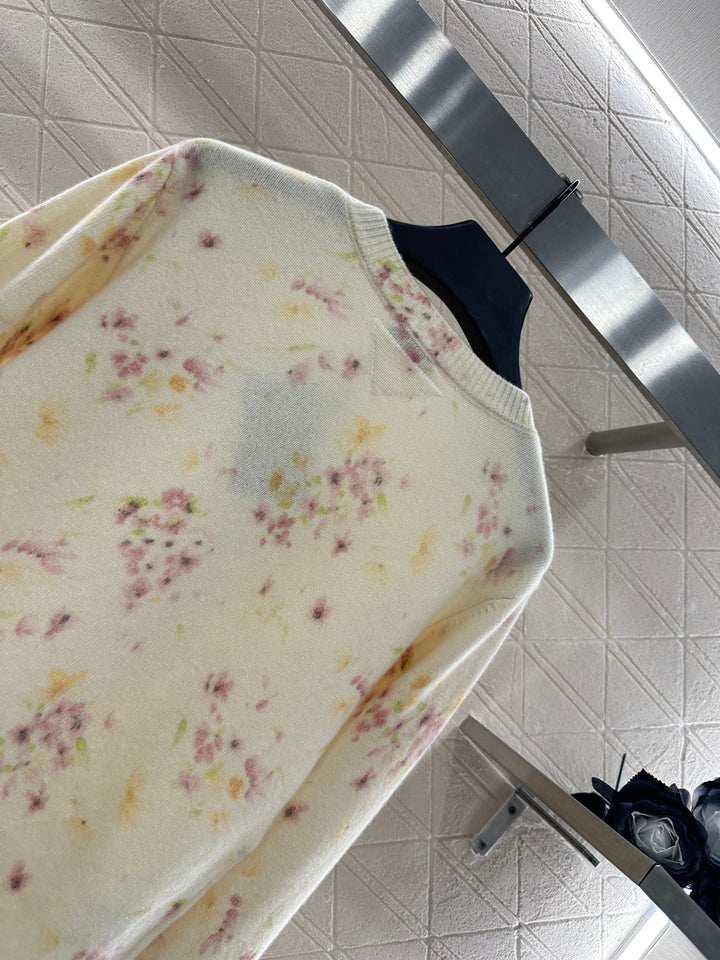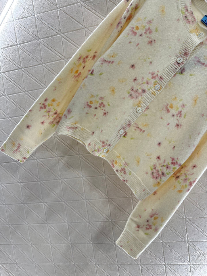 Custom-made from YB wool and mohair yarns, this cardigan offers a luxurious, comfortable, and soft feel. The round neckline and straight shoulders create a regular cut for a gentle, elegant look. The hems are finished with elastic. The vibrant, light yellow base is accented with a pink floral pattern, creating a sophisticated look. The regular fit is versatile, suitable for any figure or age, creating a sweet, youthful look.