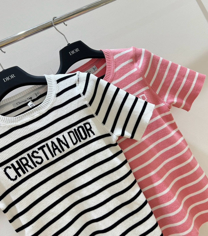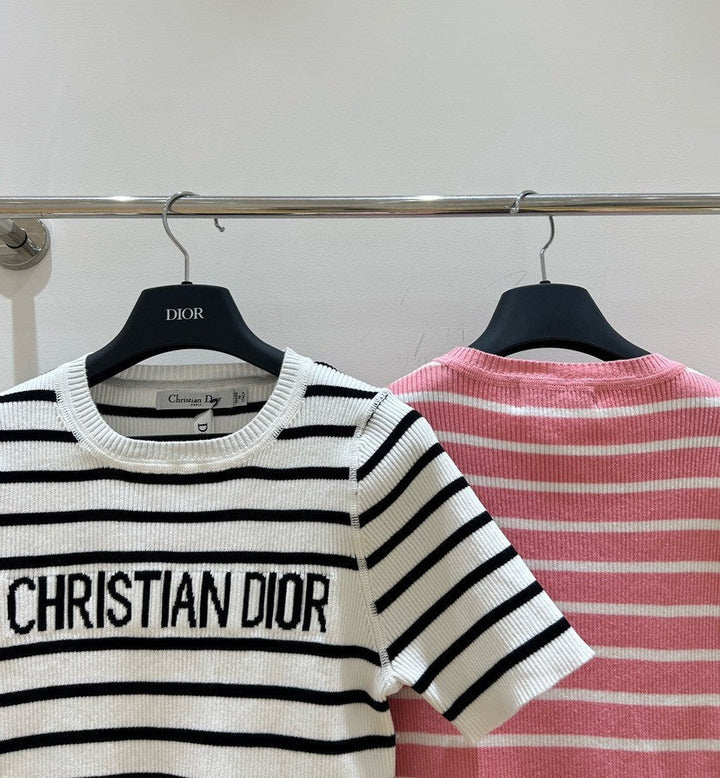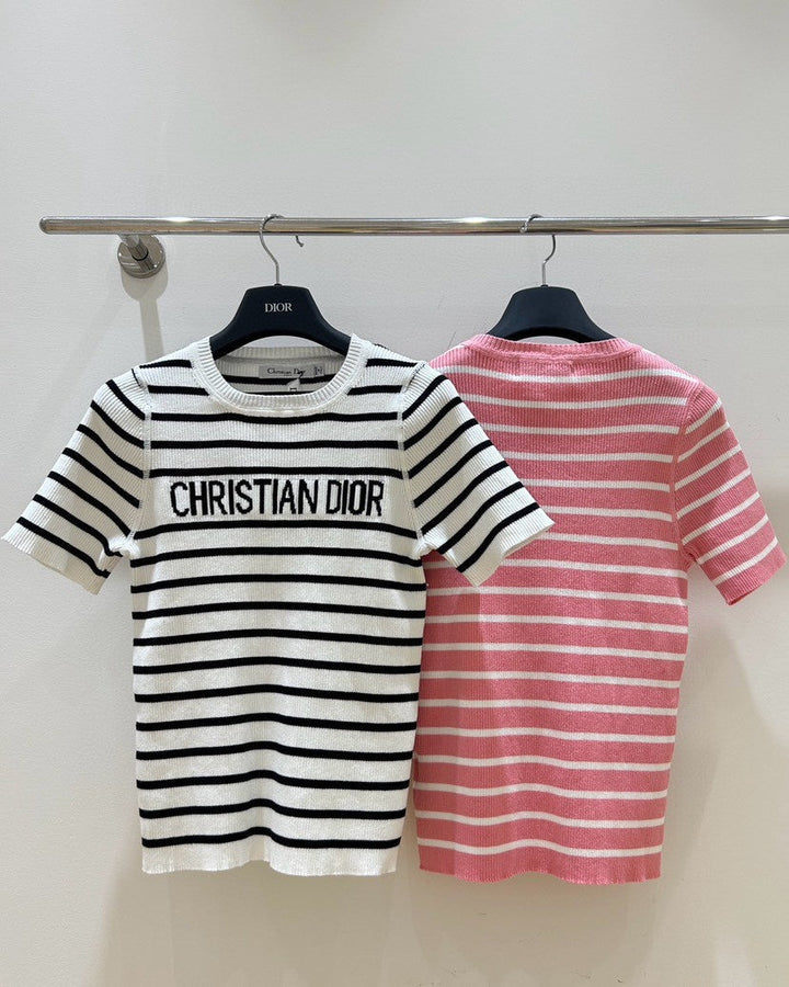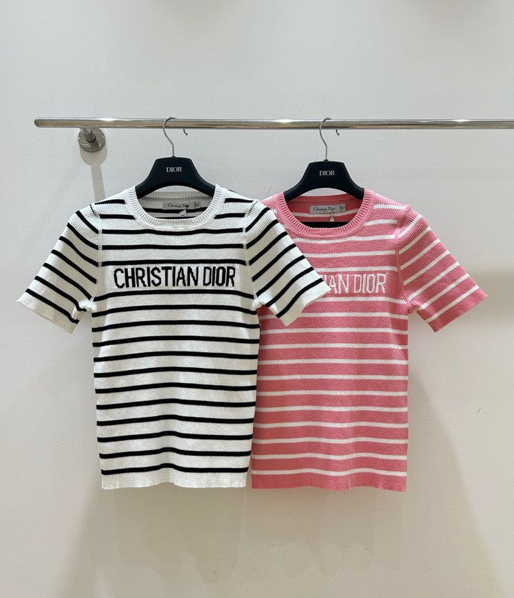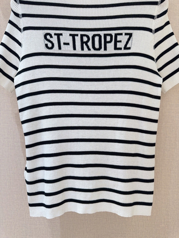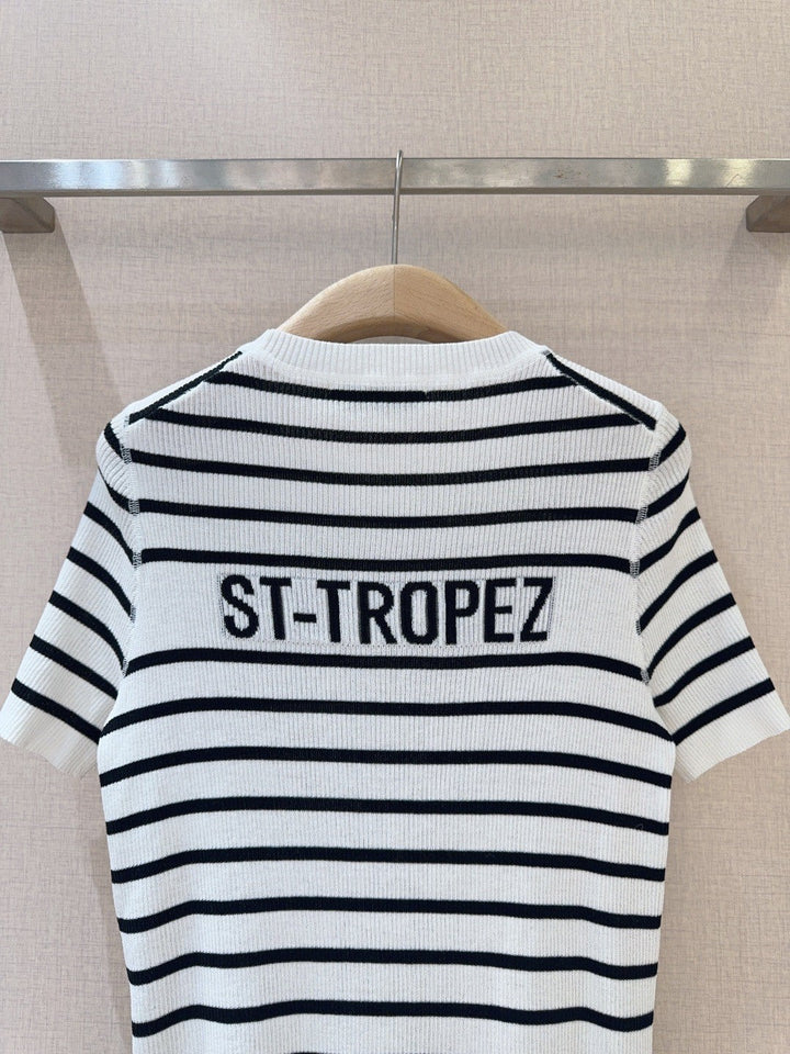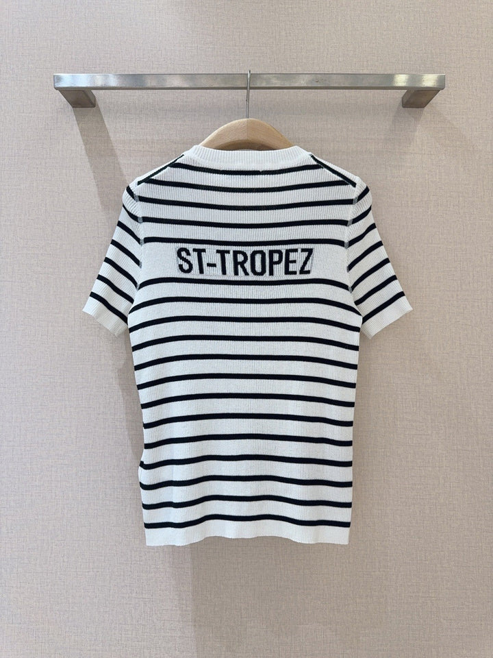 Monochrome Stripe Knit Top with Bold Text Embellishment