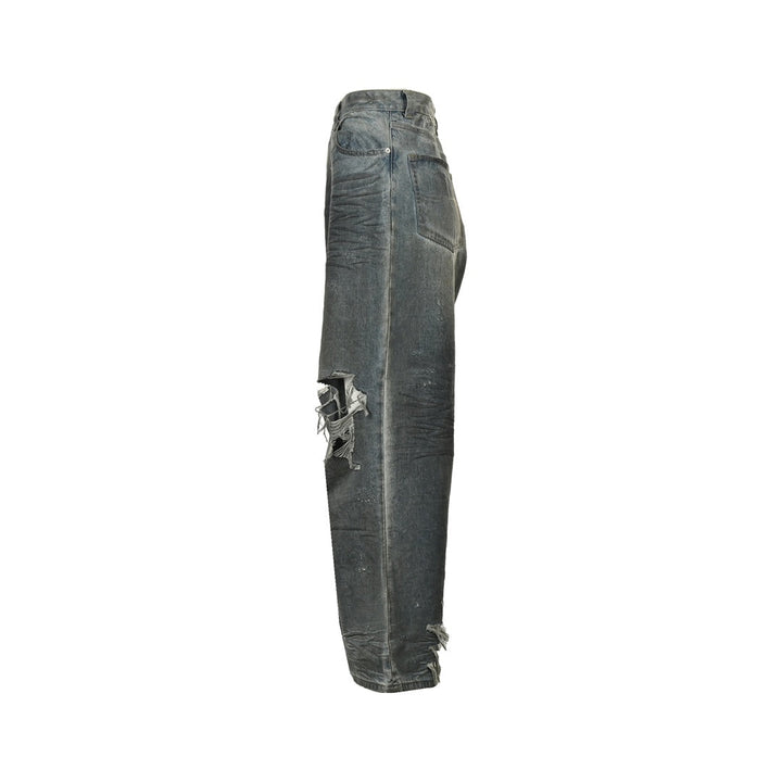 Denim denim needs to be washed out first (light blue and white), then sprayed with monkey powder, then hand-rubbed with cat whiskers, cut out erosion tassels by hand, then washed, and then destroyed by itself, and finally hand-rubbed with imported mud slurry, hand-splashed ink, the process is complicated
