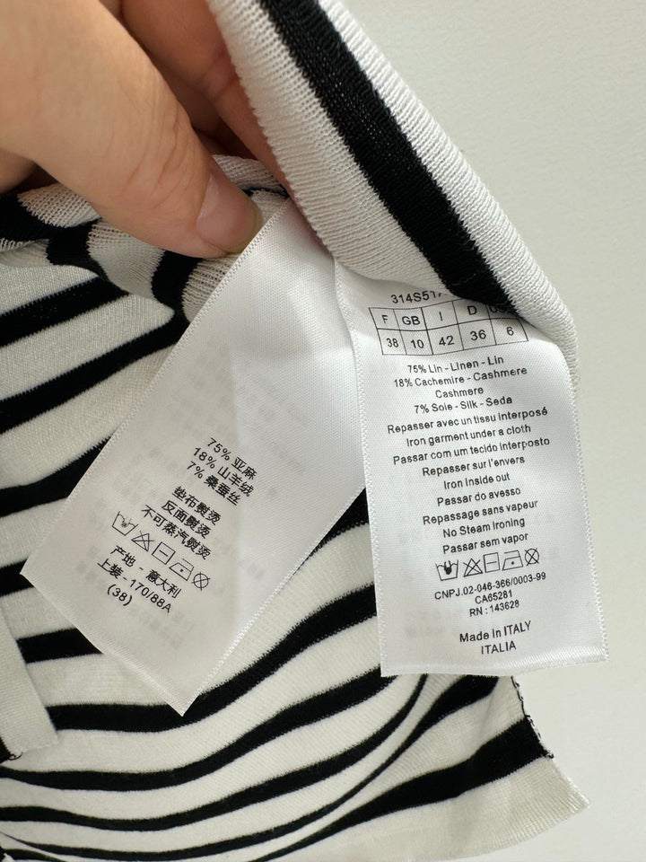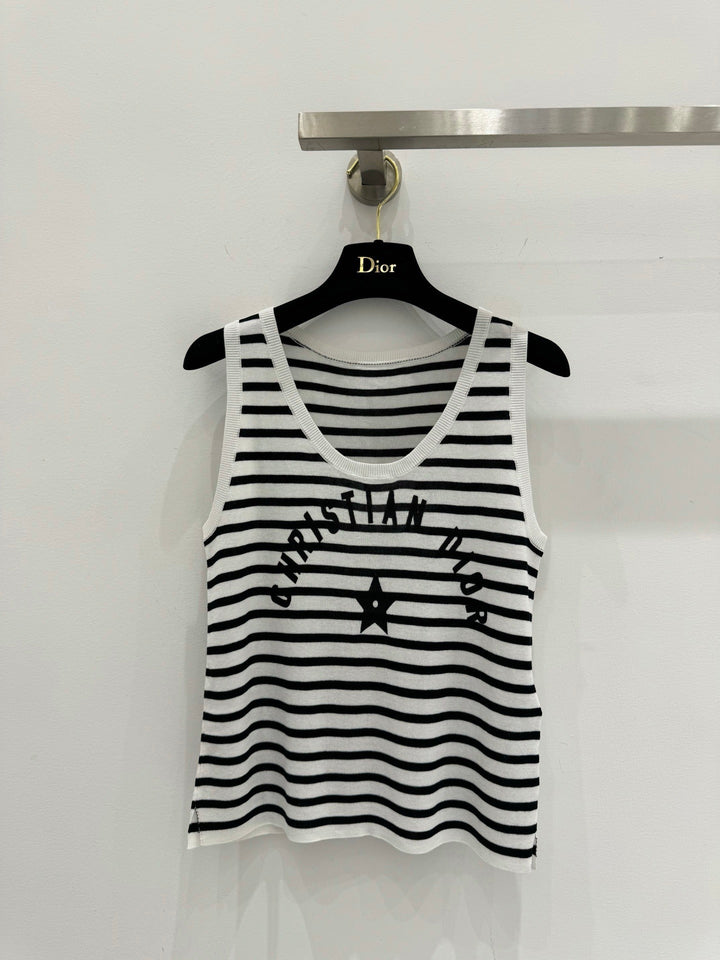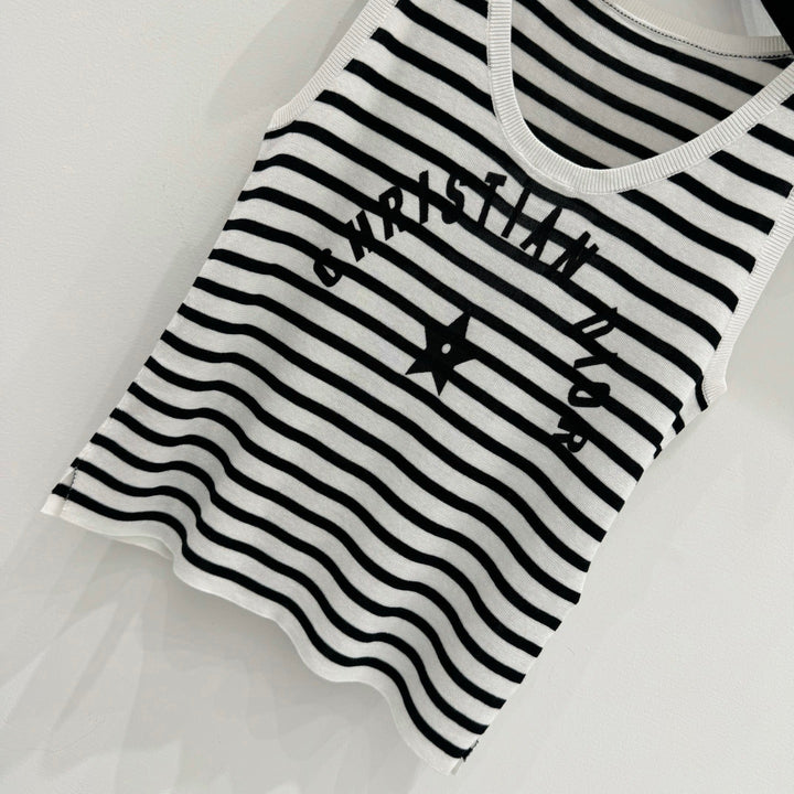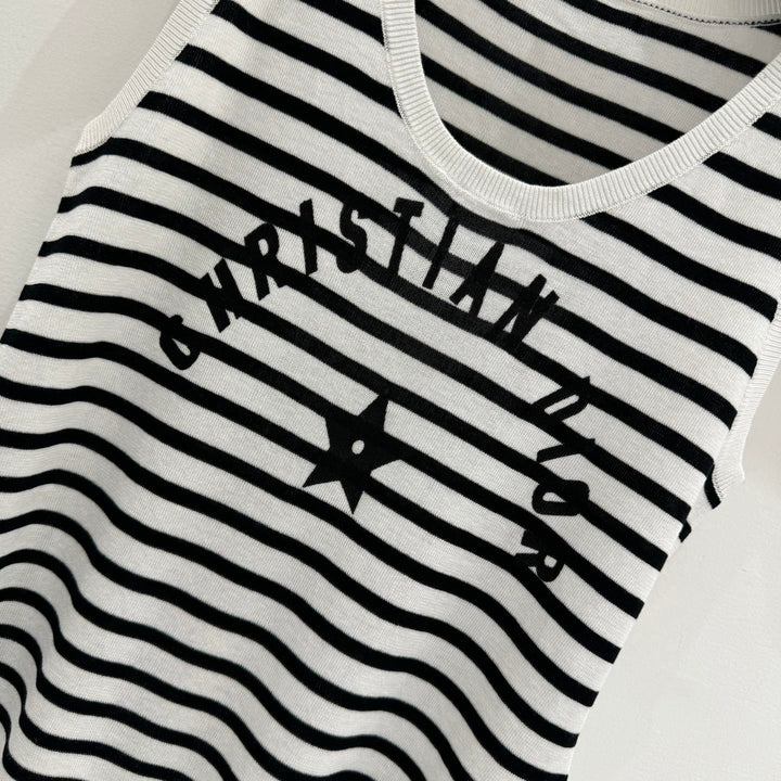 Dio*25 navy style striped happy star knitted vest top! The favorite versatile item for stripe lovers! The original imported yarn is soft, delicate, breathable and comfortable! The classic round neck version is very slimming! The positioning printed logo is elegant and fashionable! A must-have for white, rich and beautiful women! Imported woven 16-needle craftsmanship. Three sizes of 36, 38 and 40 in one color