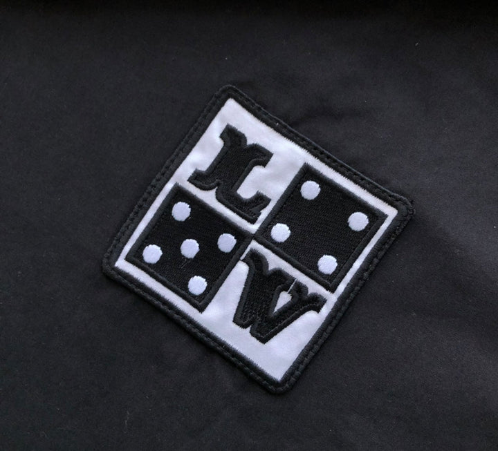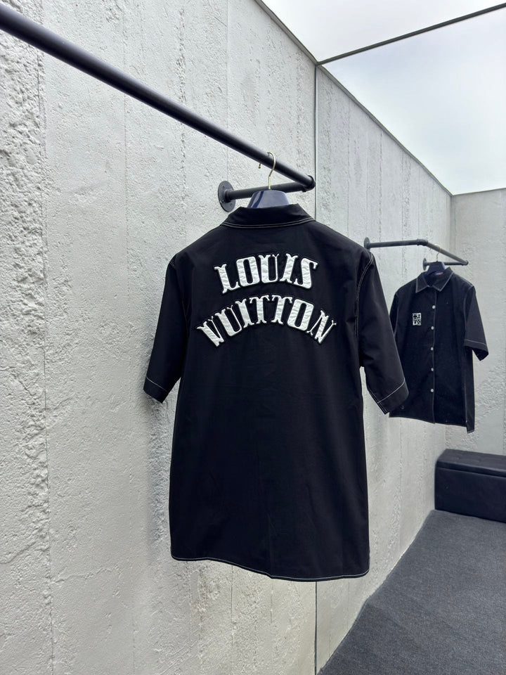 Embroidered patch on the chest with dice pattern Embroidered patch on the back Pearlescent buttons Open collar Topstitched buttons on the front 100% cotton