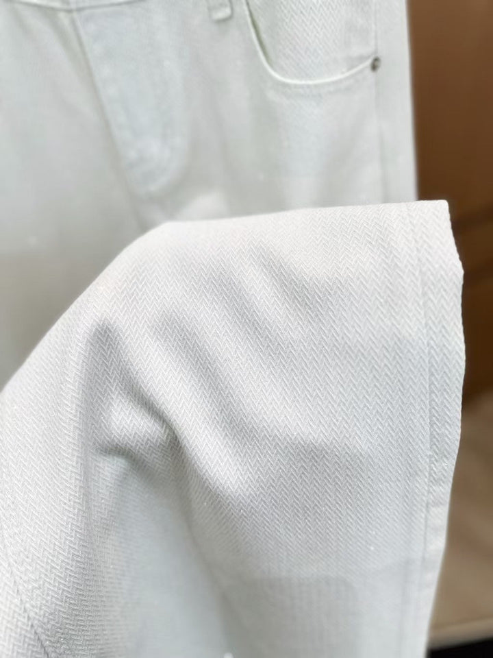 Customized latest imported twill cotton denim material V-shaped wave pattern Processed washing treatment Customized surface and accessories Elegant and elegant Straight-leg trousers cut Bone lines echo each other Zipper pockets highlight waistline Fashionable and eye-catching
