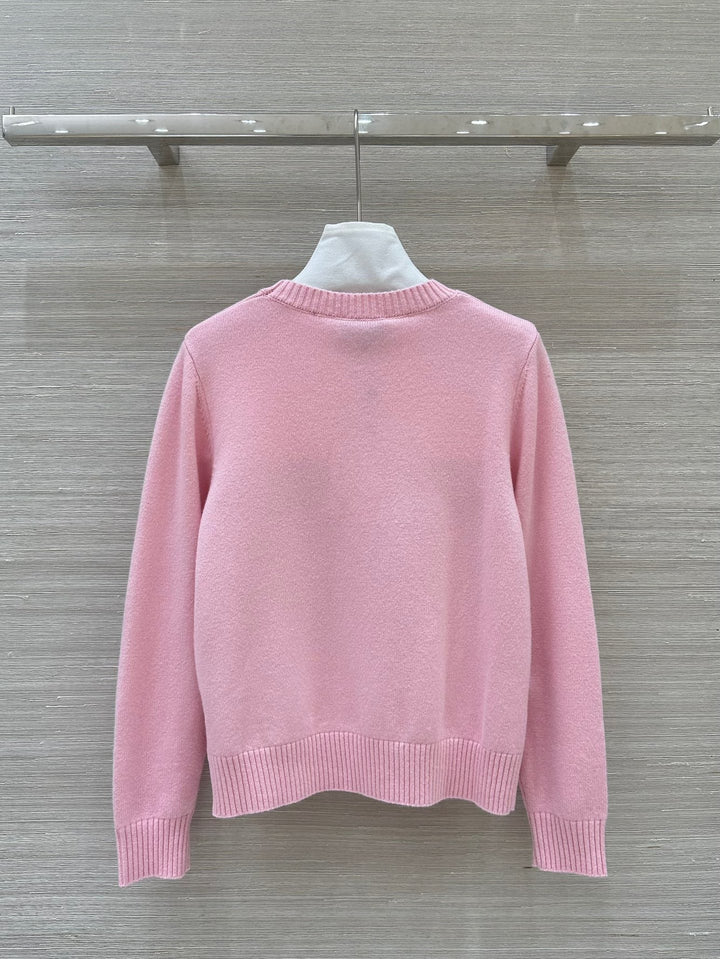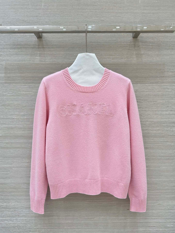 Three-dimensional letter logo embroidered cashmere round neck top + straight pants set