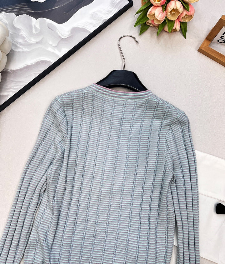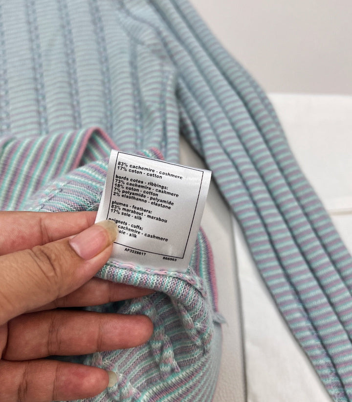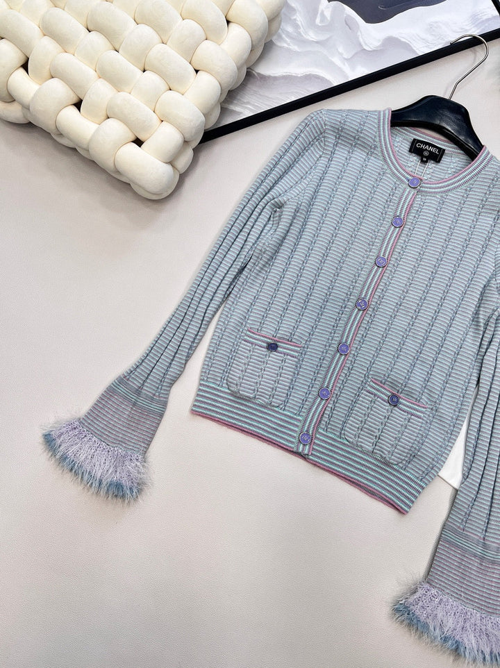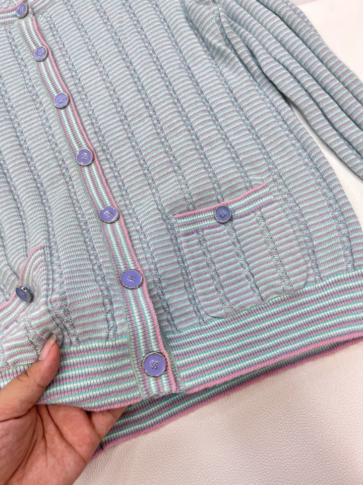 New pocket slim-fit cashmere knitted cardigan from the Haute Couture collection | ⚠ Exclusively developed by YB! High-quality product! Dyed special wool yarn, soft, delicate and comfortable, vertical stripes add a three-dimensional effect. Green and blue colored yarn with custom purple buttons for exquisite embellishment, special plush ruffle design on the cuffs, high-end fashion sense, comes with a Chanel dust bag, three complete labels