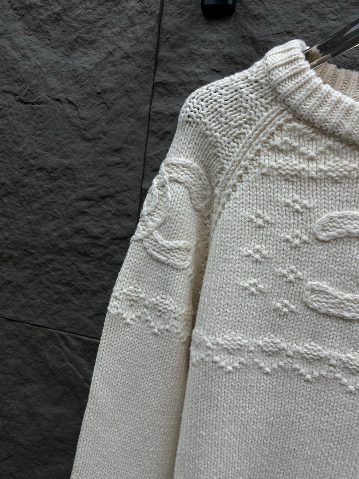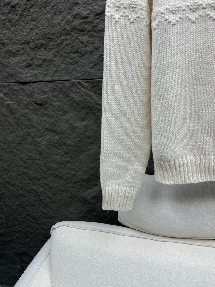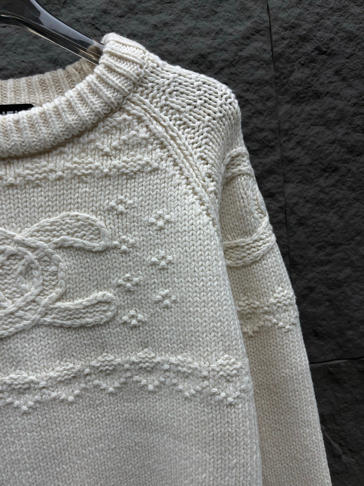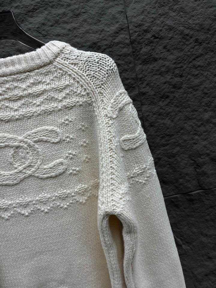 Wrap yourself in this exquisite, off-white Cable Knit Sweater, featuring the signature interlocking logo woven directly into the design. Crafted with a premium blend for ultimate comfort and warmth, this crewneck is a classic statement piece for the cooler months. Pair it with trousers for effortless sophistication, or denim for a chic weekend look. A wardrobe staple that never goes out of style