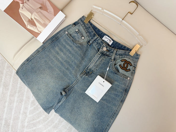 Contrast color embroidered logo jeans