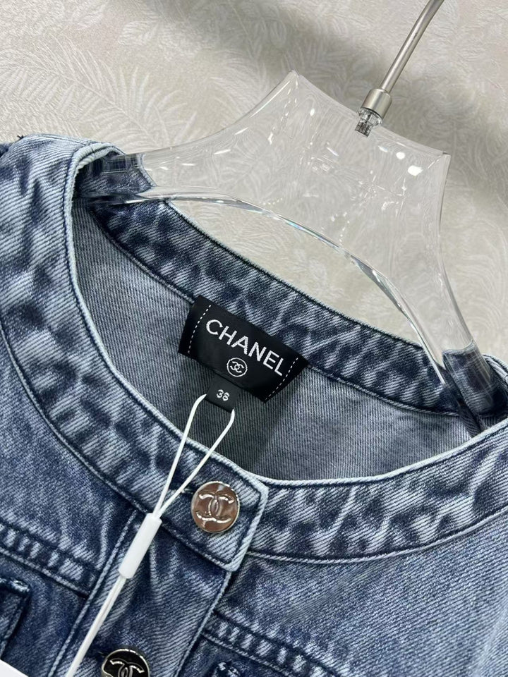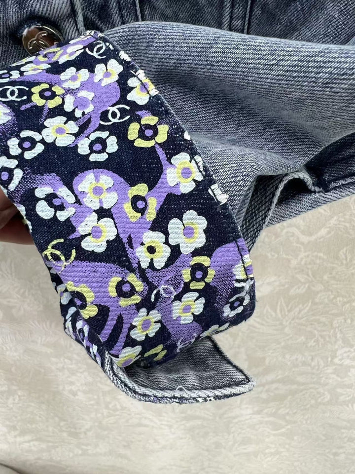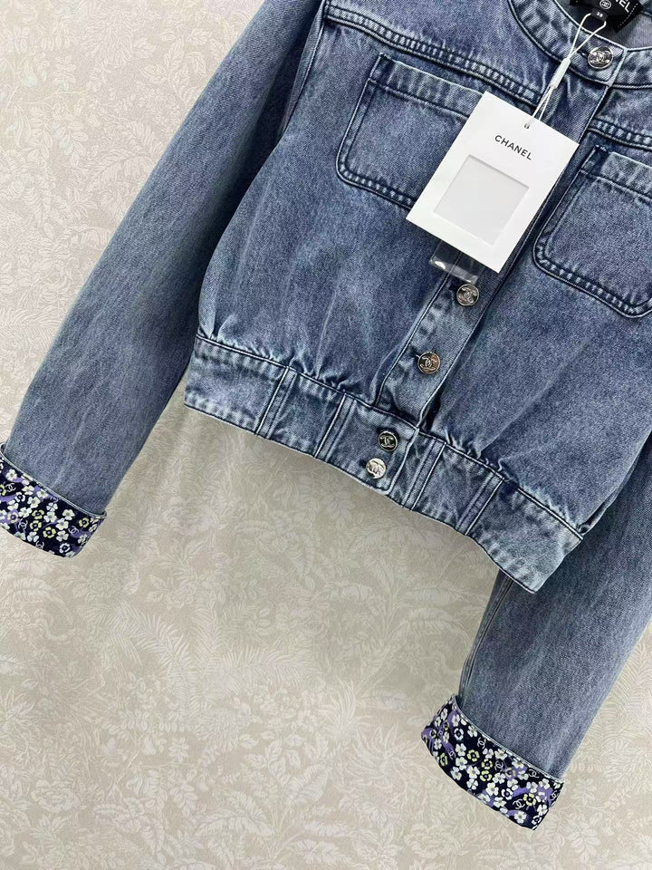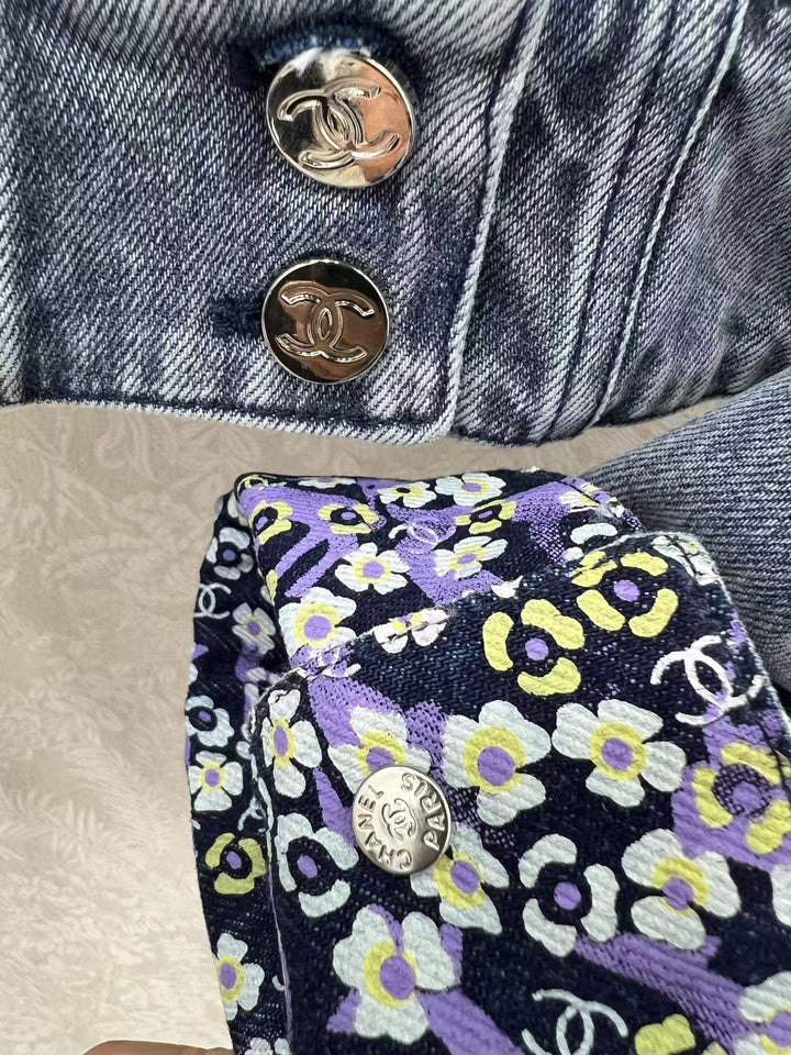 25 new retro denim jacket with logo print on cuffs Customized YB imported twill cotton denim material Comfortable and stylish Tailoring and details enhance refinement Symmetrical pockets and hem with slightly waisted tailoring Adds layering to the shape Low-key luxury Development of surface and accessories Customized double C hardware Can be matched with different items in the same series Complete outfit with soft breath to enhance charm Simple and advanced upper body