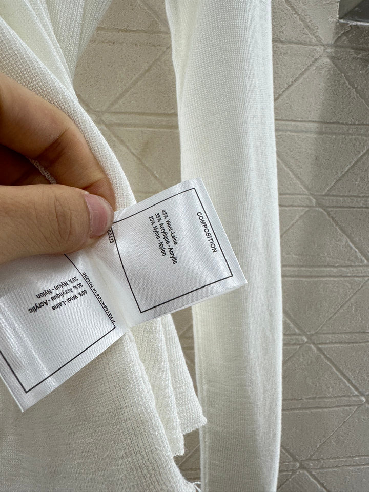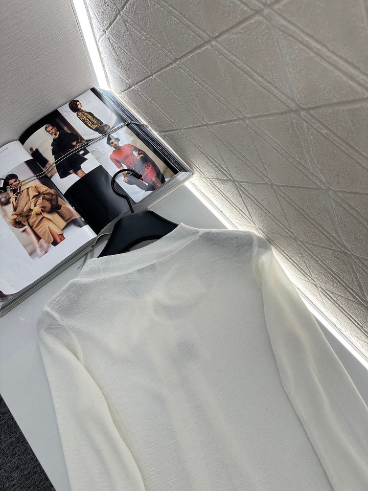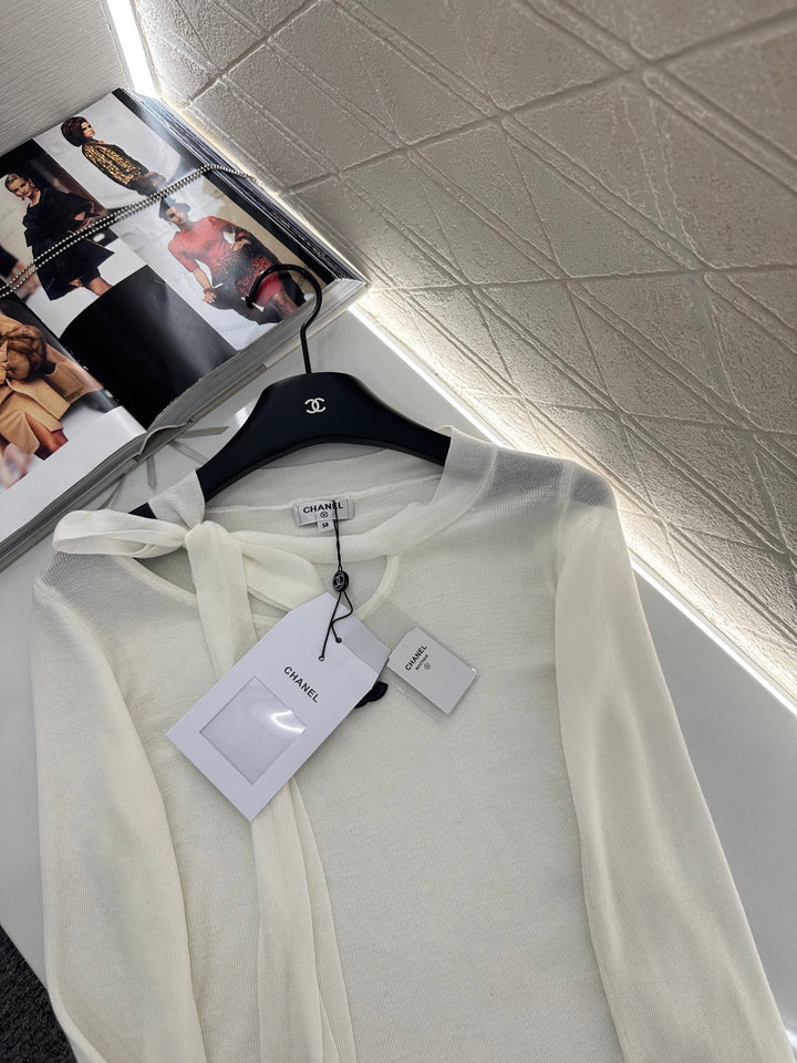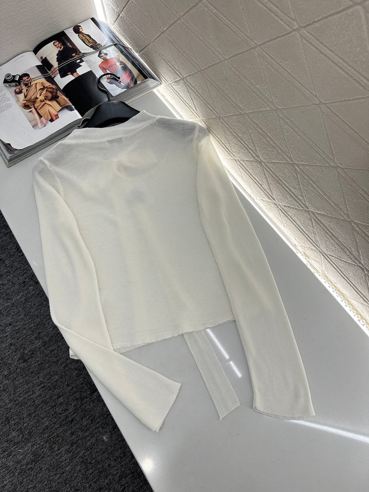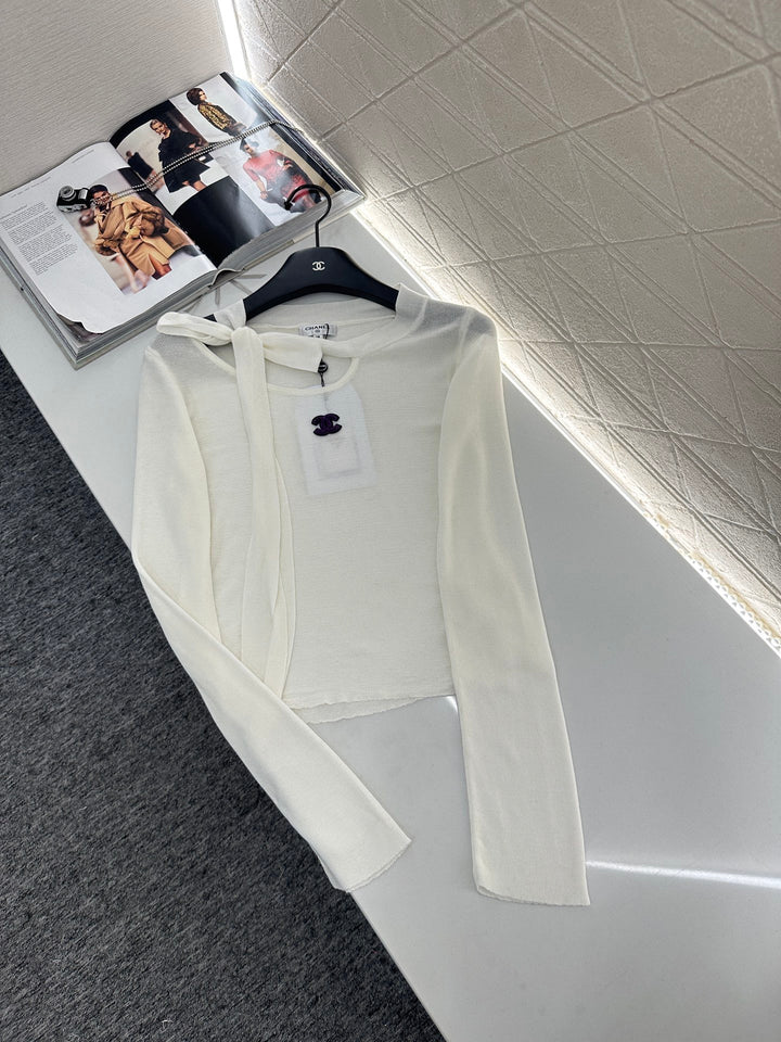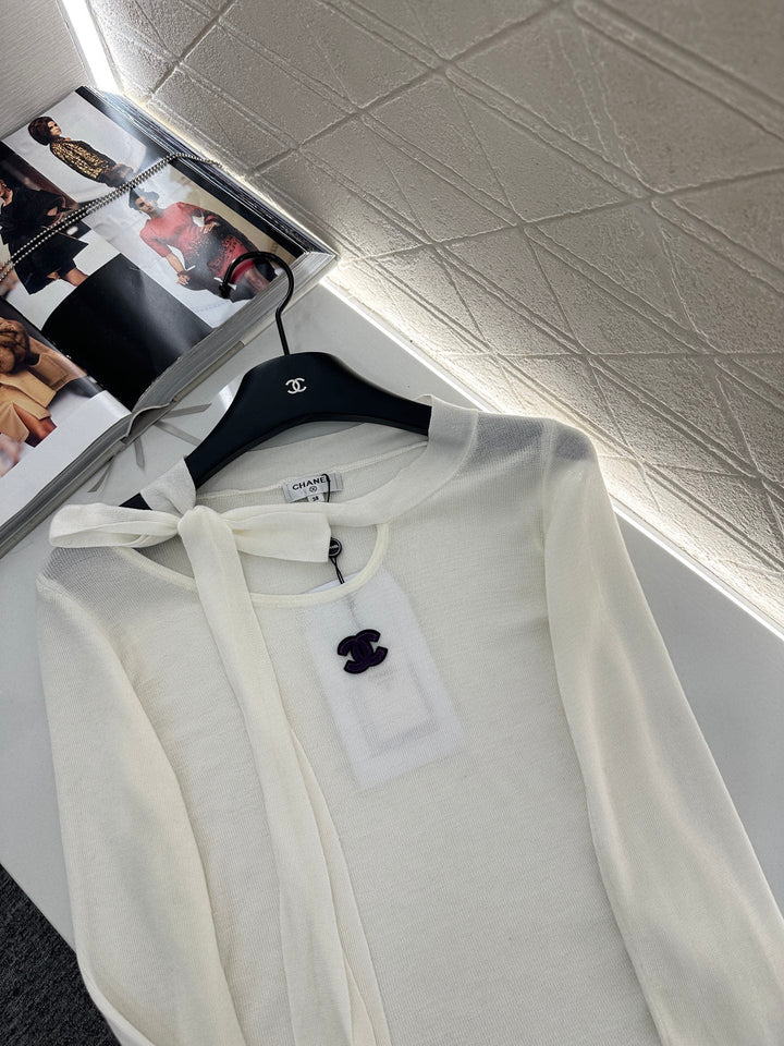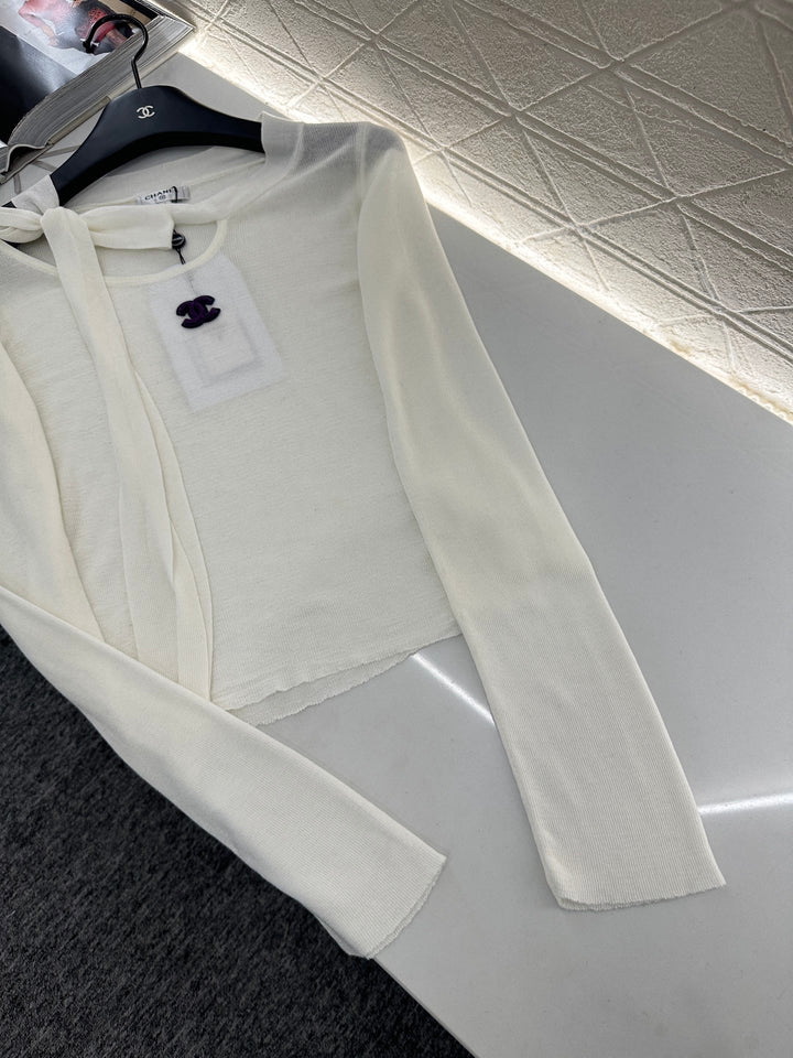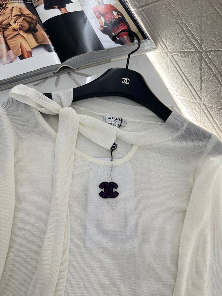 Woven from wool yarn for a comfortable, stretchy feel. Long-sleeved stretch top with a cutout collar and asymmetrical off-shoulder design. Paired with a tie-drap bow, it creates a layered, elegant look. The signature double C embellishment on the chest adds a touch of luxury, eschewing the monotony. The slim, fitted silhouette hugs the body for a refined, refined look. Perfect for both fall and winter layering. Made to order with fabric and accessories. Check for the high-quality version. Available in three colors: 36, 38, 40.