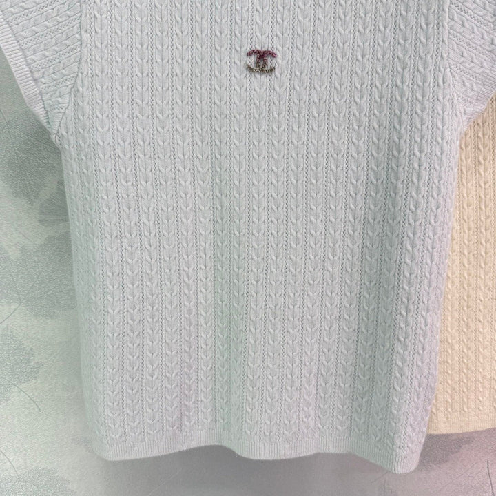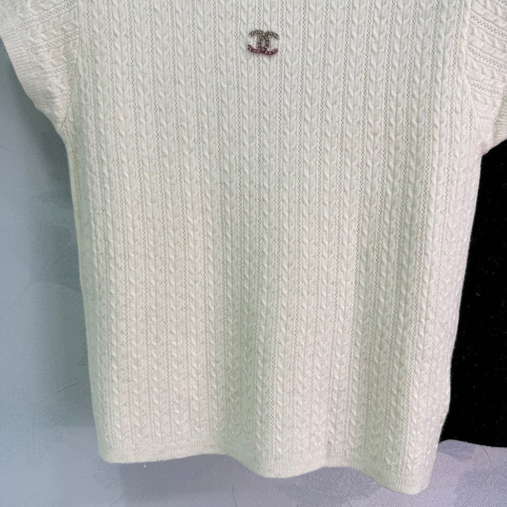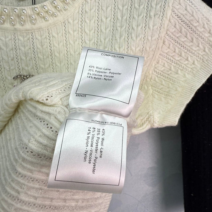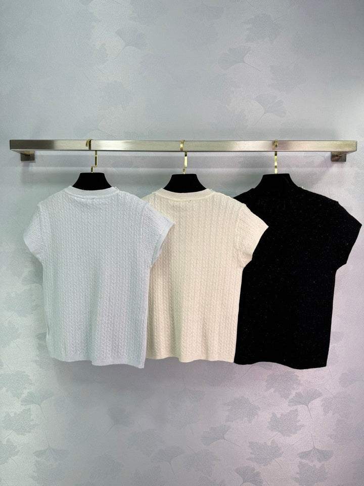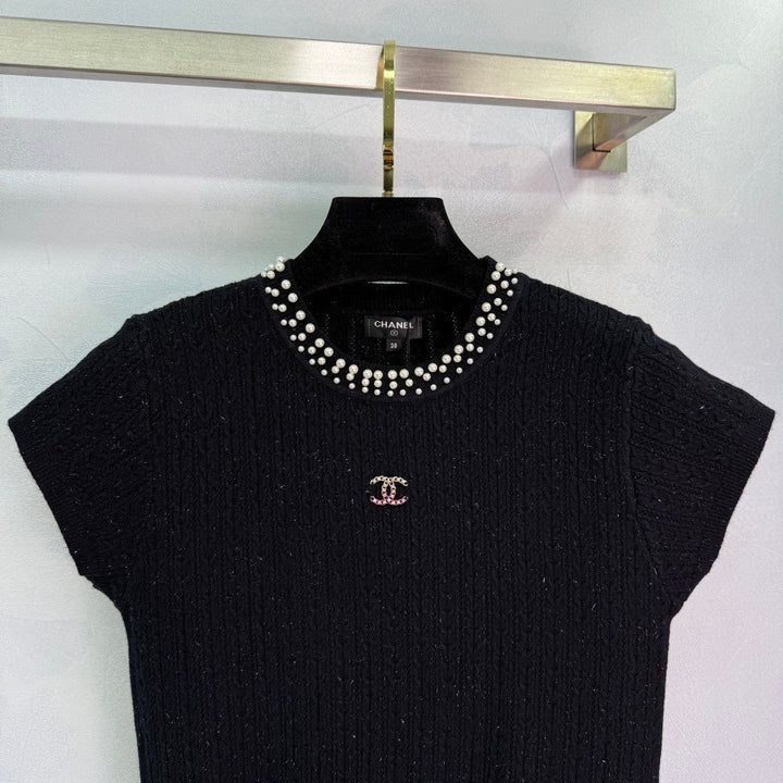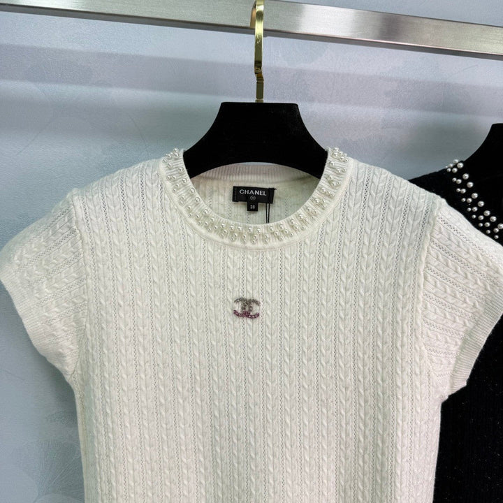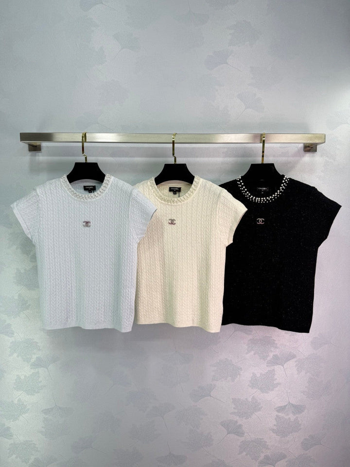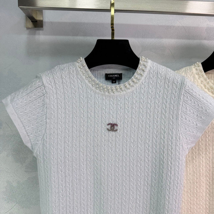 Pearl-Trim Textured Knit Short-Sleeve Tops