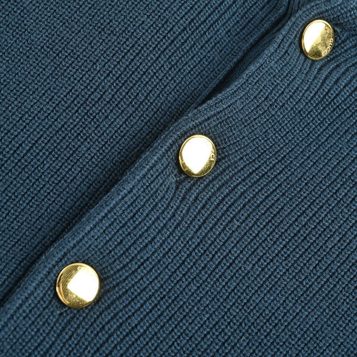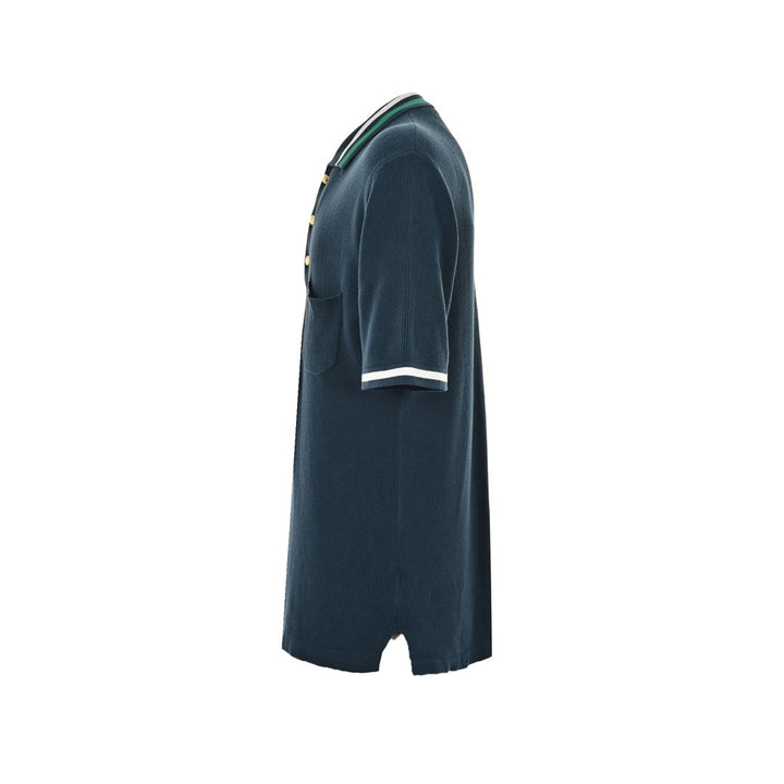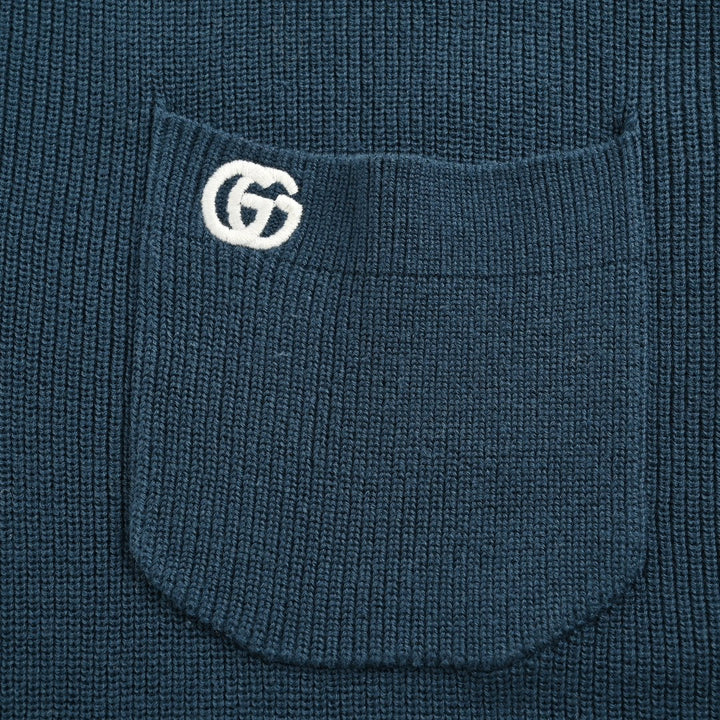This style is made of dark blue cotton-wool knitted blend, Double G embroidery, gold-toned buttons, polo collar, short ribs, patch pockets, striped rib piping, button placket