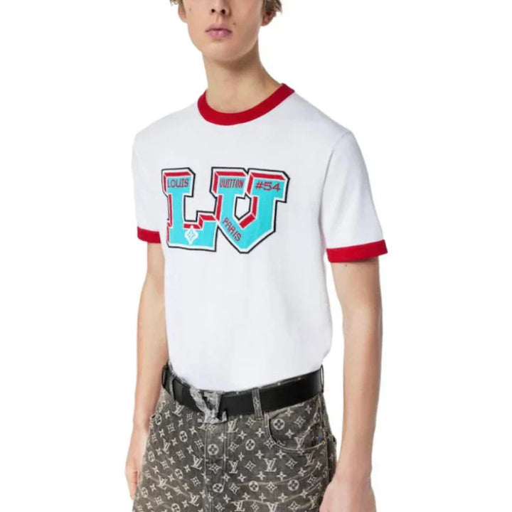 Red and blue jacquard large letter short sleeves