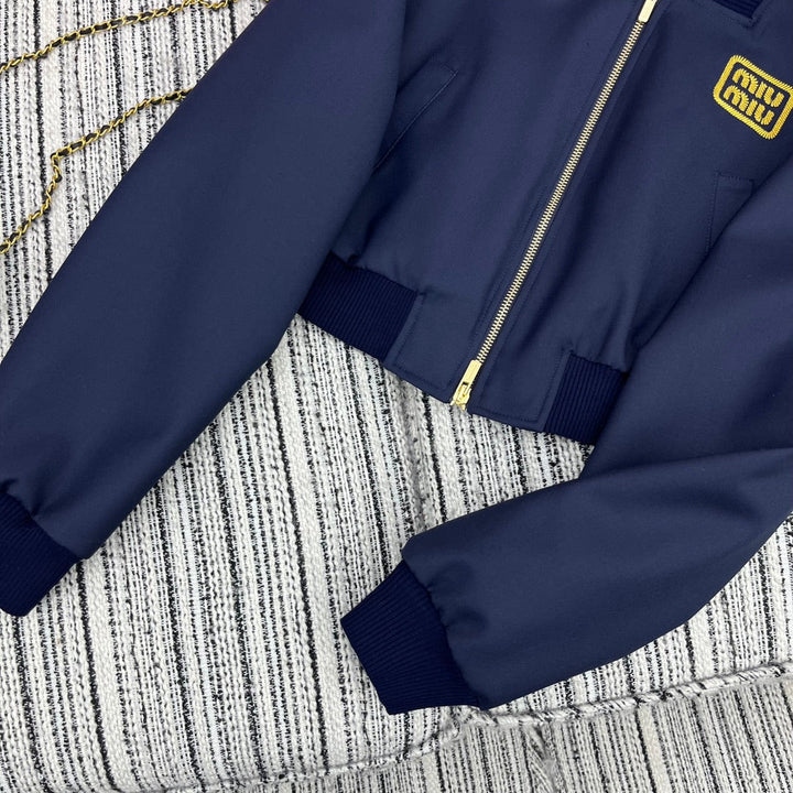 Contrast gold-trimmed logo embroidery, ribbed knit collar and hem