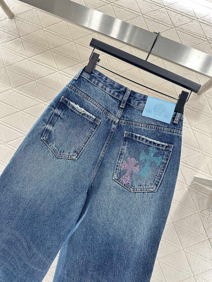 Custom YB twill cotton denim, enzyme-washed. Perfectly textured, with a dark blue bleached white for a vintage look. High-waisted, wide-leg straight-leg trousers. Cross embellishments are achieved with irregularly placed rhinestones. The colorful diamonds shimmer and captivate. The design is cool and stylish, complemented by a matching leather patch on the back. Relaxed yet fashionable, it fully showcases the brand's positioning and complements the high street appeal. Customized fabrics and accessories. Look for the latest version. 𝑆𝑀𝐿