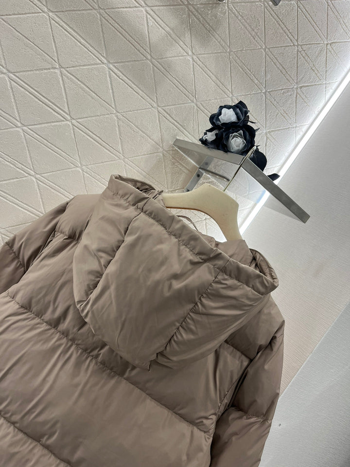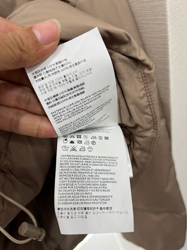 Windproof and waterproof nylon material White goose down filling lining The whole piece is light and warm Hooded snap-button jacket style Elastic cuffs + narrow drawstring hem Excellent windproof and cold-proof effect Garment fabric is decorated with shiny gold buttons The chest is highlighted with a signature letter logo to highlight the design With large-capacity side pockets The shape is crisp and the style is high-end Regular version is not picky about style and body shape Easily create a brand-exclusive sweet and cool style Paired with skirts and pants, it shows a high street fashionable style Filling standard: National standard 90 down Filling material: white goose down