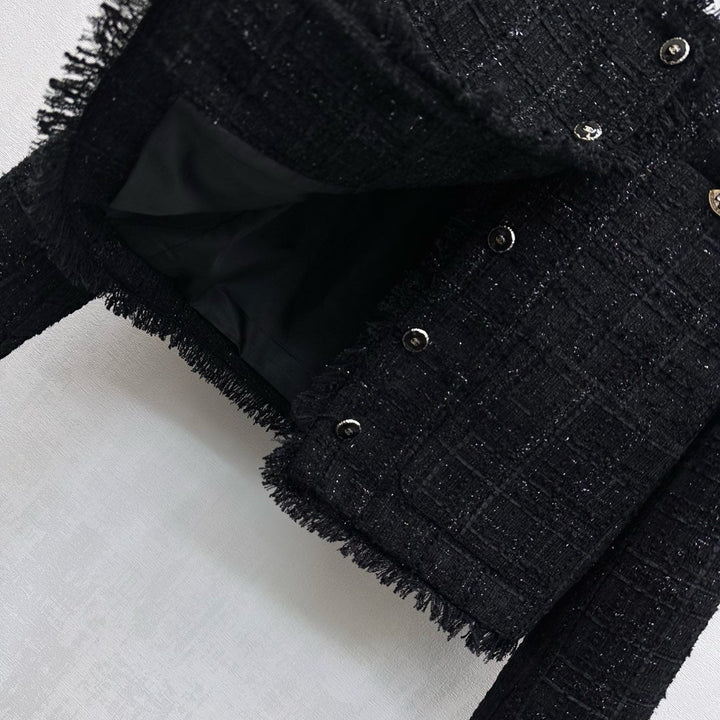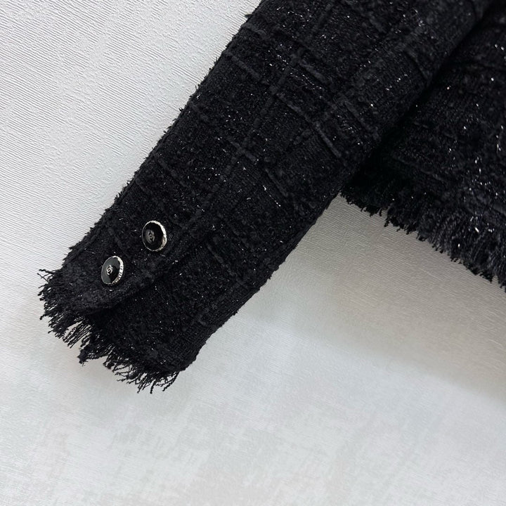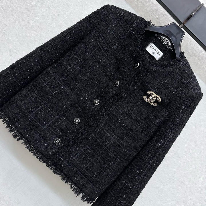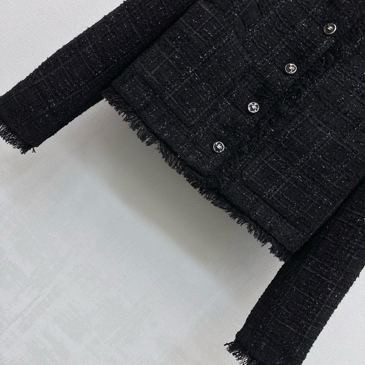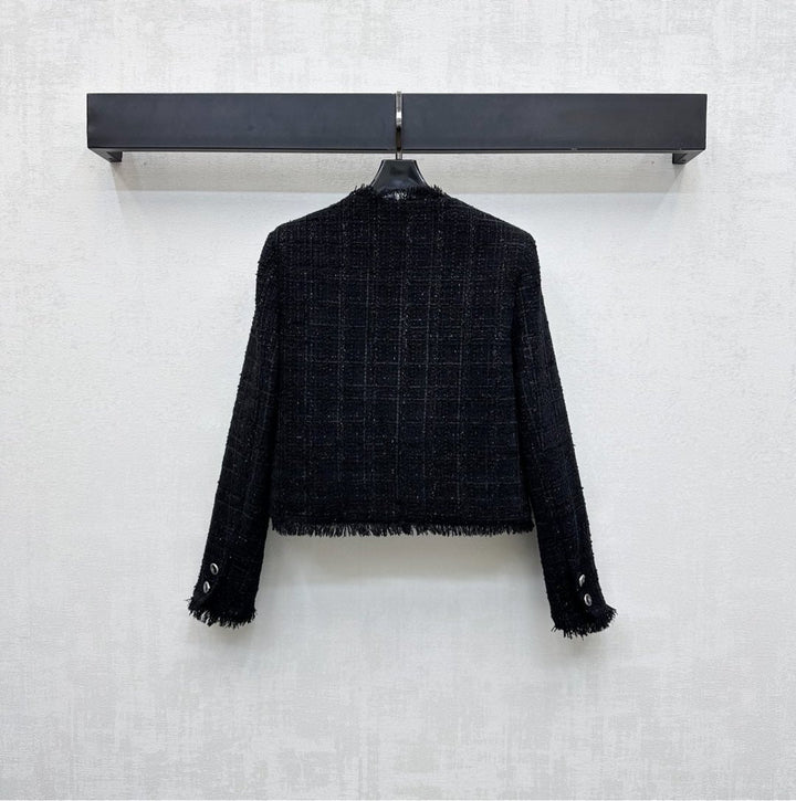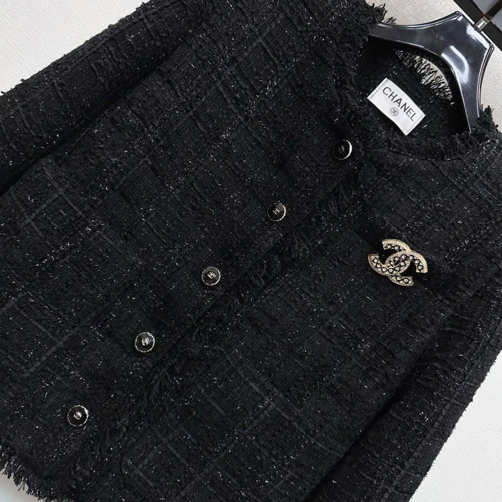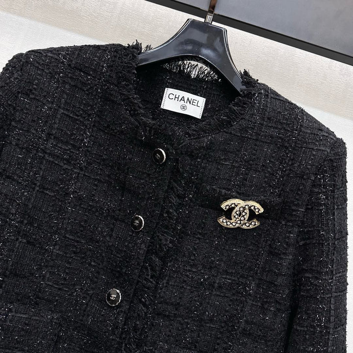 2025 New Arrivals: Round-Neck Brooch Dress Jacket. Custom-made YB imported wool tweed material, high-quality texture and excellent appearance. Straight shoulder pad design fits the body, making the figure more slender and upright. Silver yarn interwoven texture is used throughout the body, and the wool wadding highlights the details and adds a sense of layering. The pure black color scheme is noble and textured, and the intellectual and gentle feeling is enhanced. The iconic double-letter brooch on the chest echoes the round letter buckle on the front, highlighting the brand's tone. Developed fabrics and accessories. Round-neck dress jacket tailoring is the perfect choice for attending formal occasions.