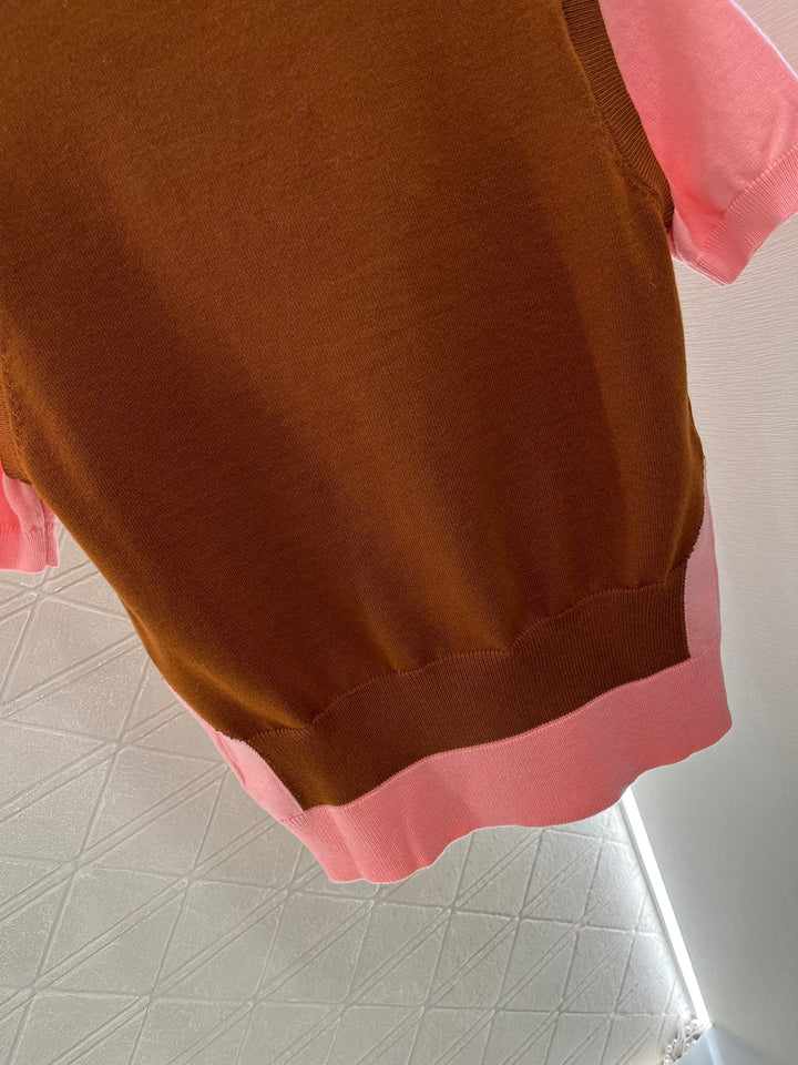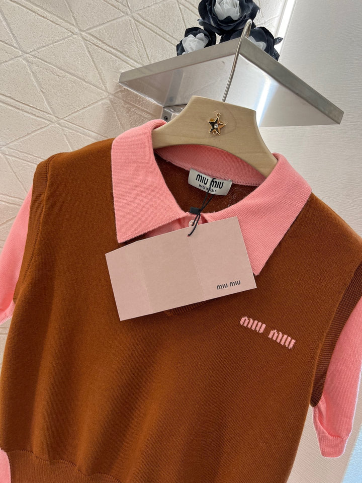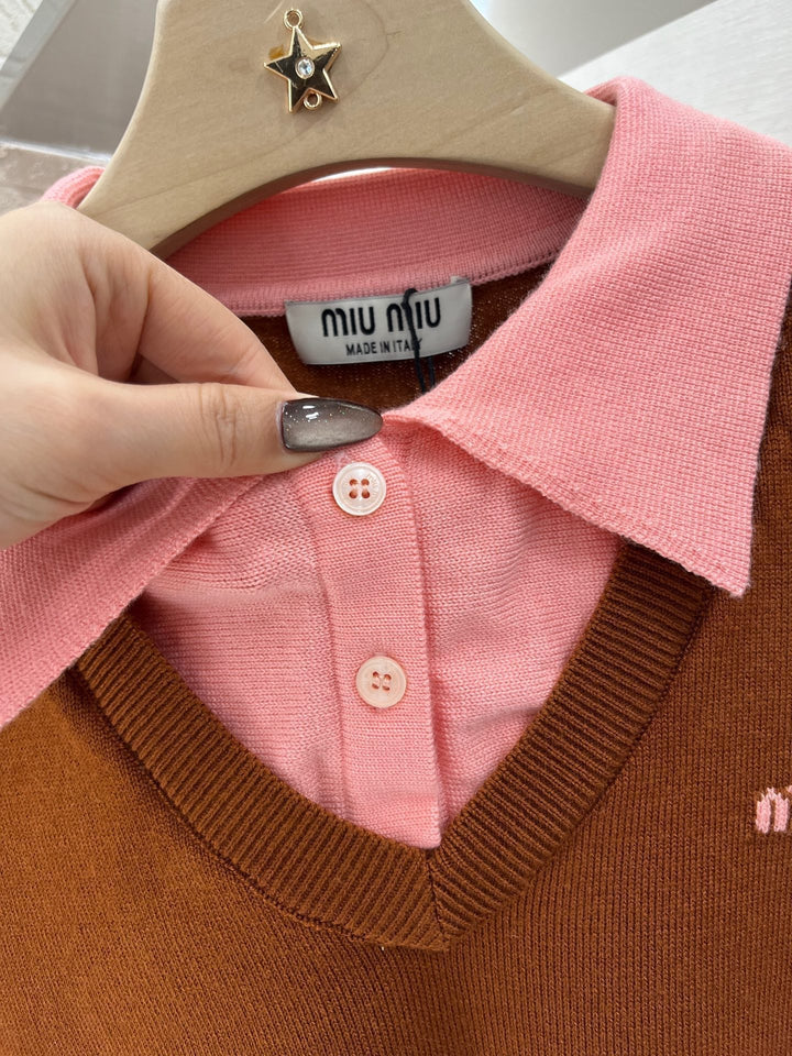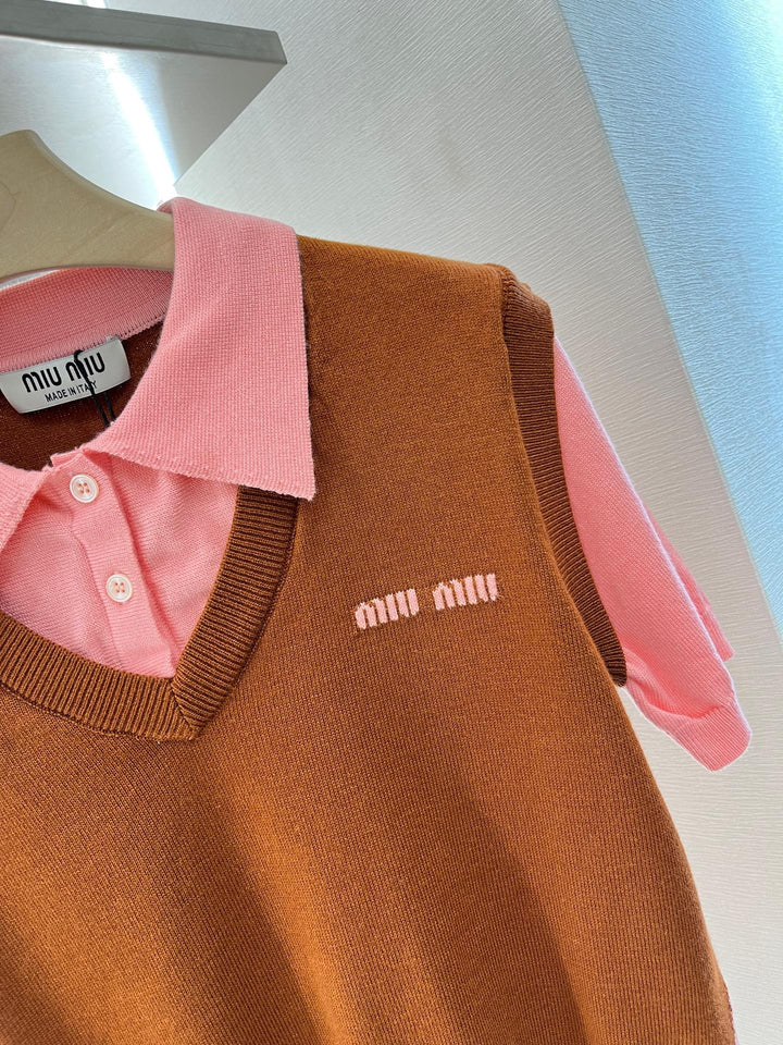 Wool knitted material, delicate texture, skin-friendly and comfortable, fake two-piece layered version, inner lapel 𝑝𝑜𝑙𝑜 knitted short sleeves, neat tailoring, half-open details can be adjusted at will, buttons can be neatly unbuttoned for more relaxation, outer layer superimposed V-neck vest for decoration, adding literary and cute atmosphere, with the letter logo m on the chest, it is more refined, fashionable and stylish, wearable in all seasons, fake two-piece sweater knitted, advanced and stylish