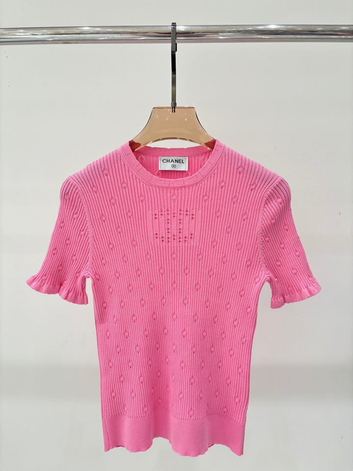 25 Summer new round neck letter logo hollow jacquard simple slim knitted short sleeves