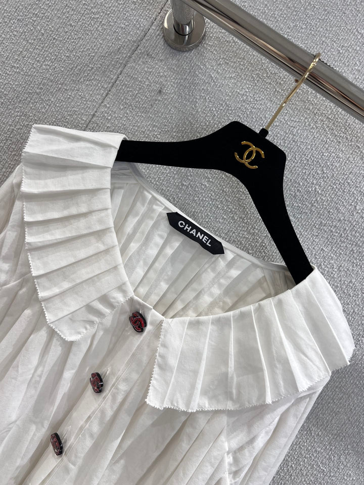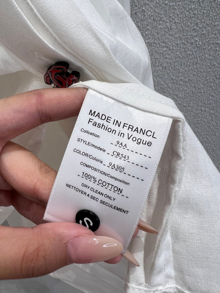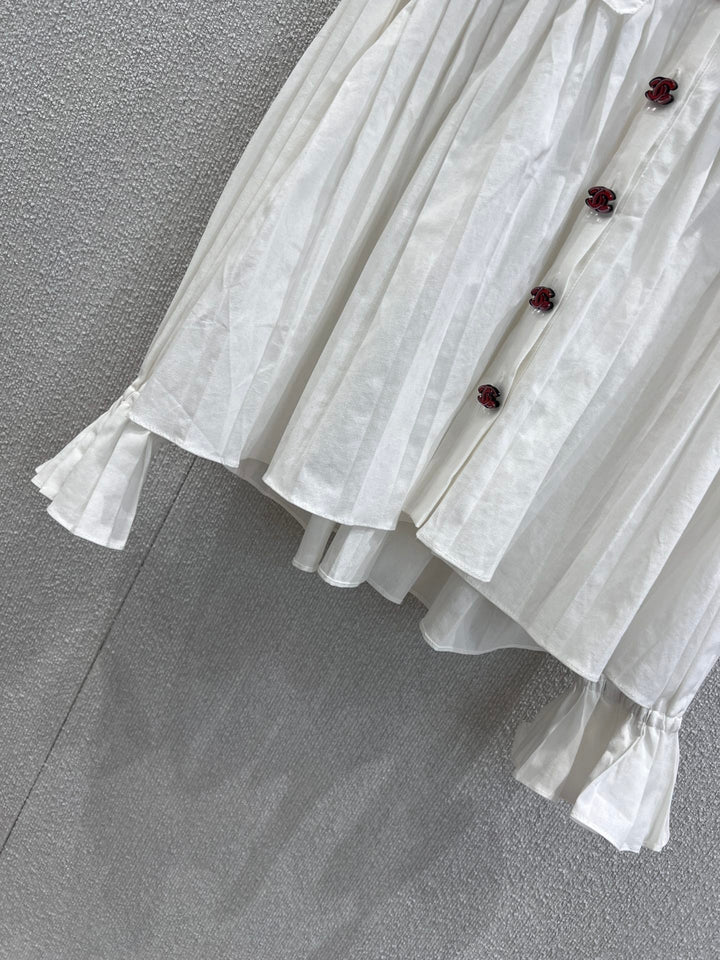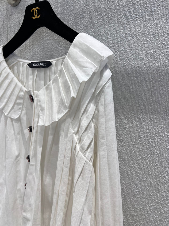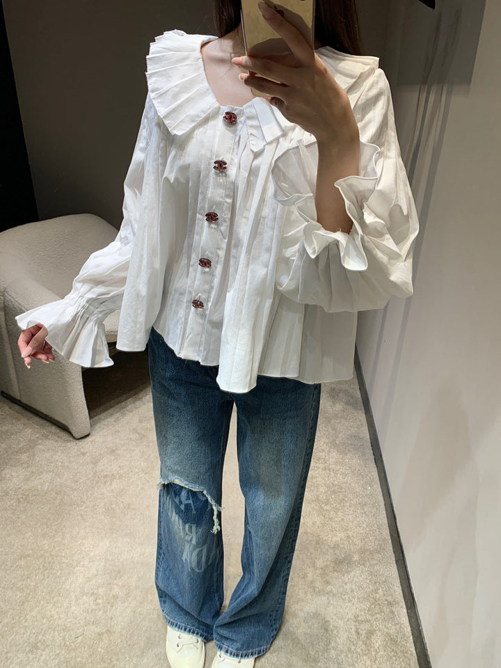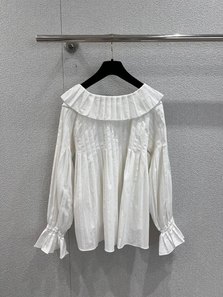 25Fw Fall/Winter New Single-Breasted Pleated Doll Collar Long-Sleeved Shirt | ⚠Exclusive High-Rise Edition! A romantic interpretation of French elegance. Oversized pleated lapels stretch like petals, while flared sleeves create a vintage, puffy feel. Red resin double C buttons, a signature brand symbol, add a touch of vibrancy to the look. The lightweight cotton fabric drapes gently, while the vertical pleats at the chest and the irregular hem give the classic white shirt an artistic touch, perfect for any style.