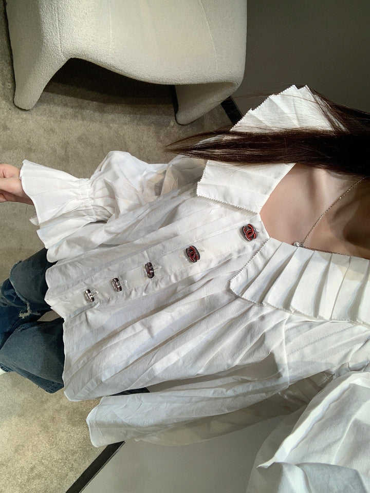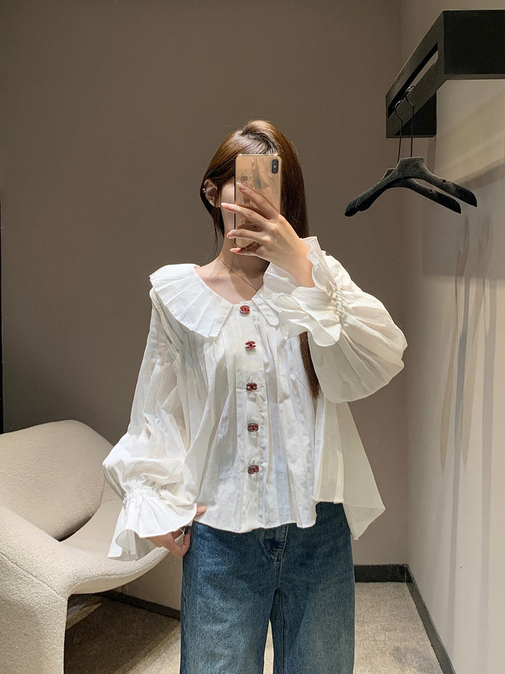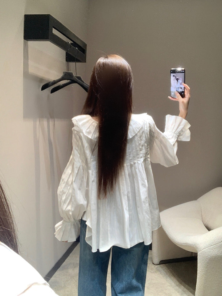 Single-breasted pleated long-sleeved shirt with a baby doll collar