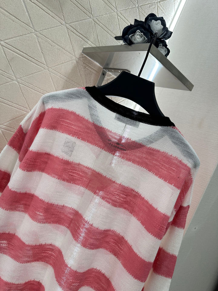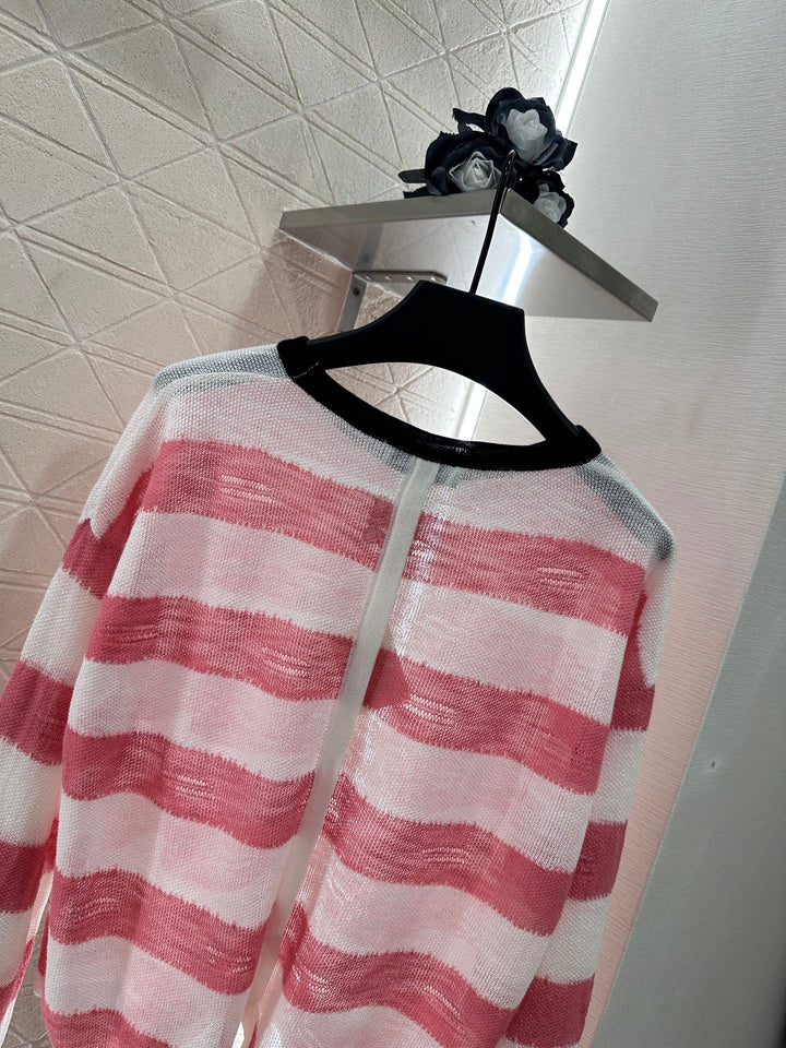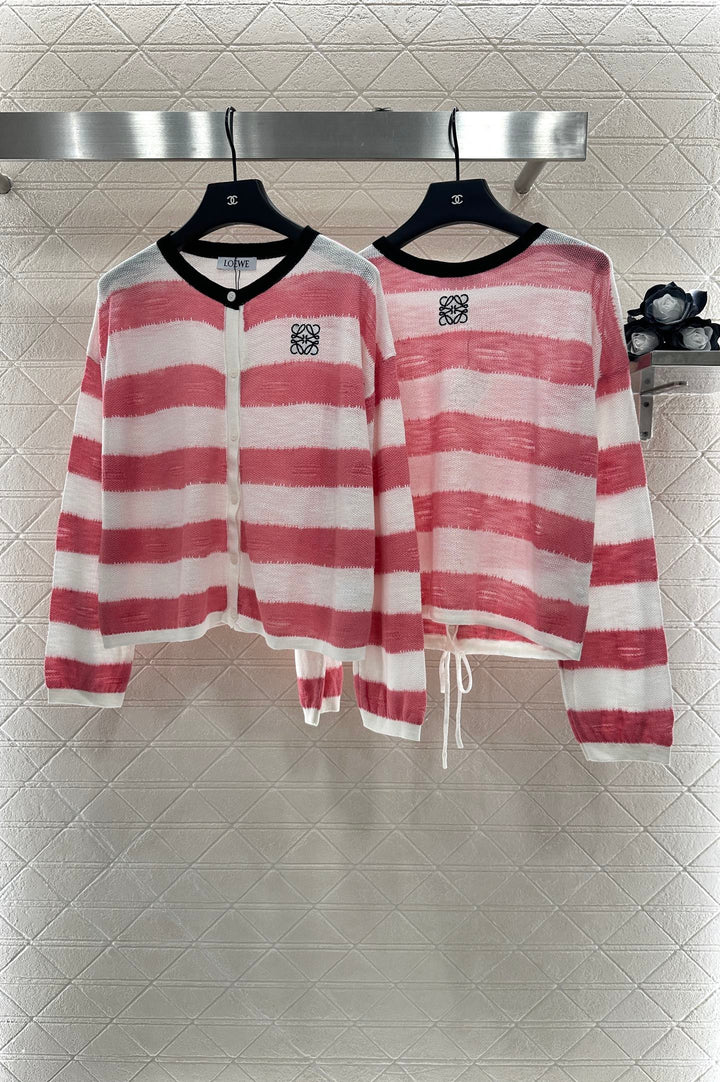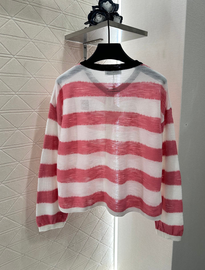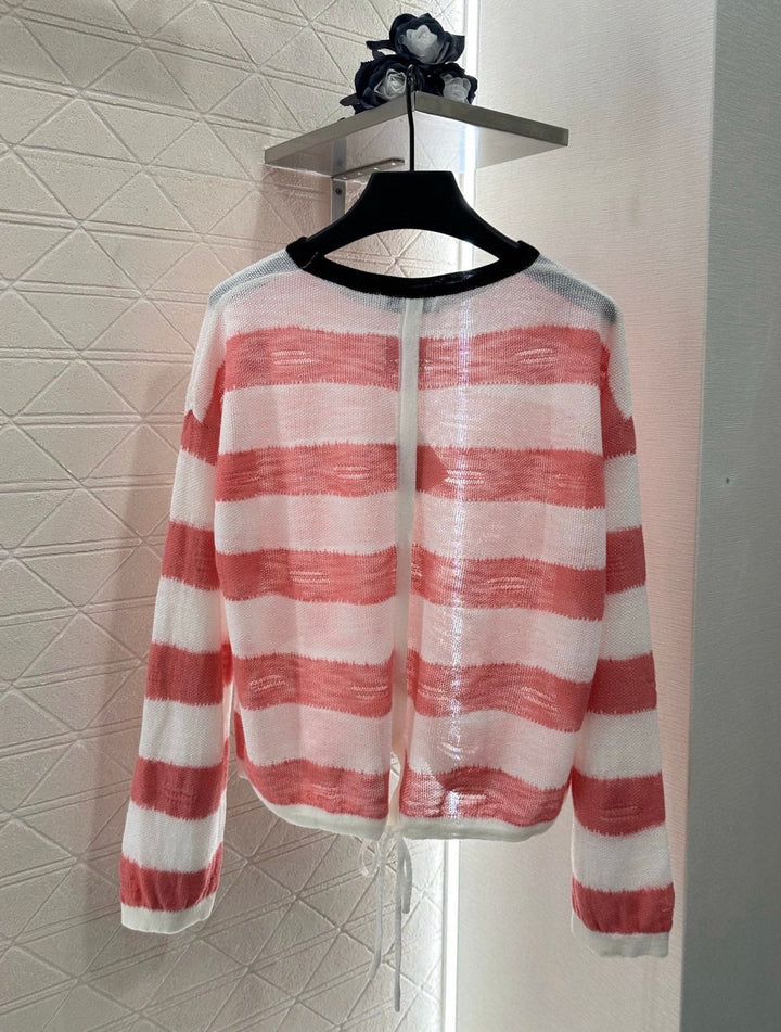 Striped knitted long-sleeved cardigan. Crafted from custom YB Tencel yarn for a refined, stretchy, and comfortable feel, this round-neck cardigan flatters the head-to-shoulder ratio for a slimming effect. The iconic brand logo on the chest adds a touch of sophistication. Interwoven red and white stripes intertwine throughout, and black binding details the collar and hem, creating a retro, preppy look. The regular, loose fit creates a stylish, slimming look, perfect for everyday wear or events.