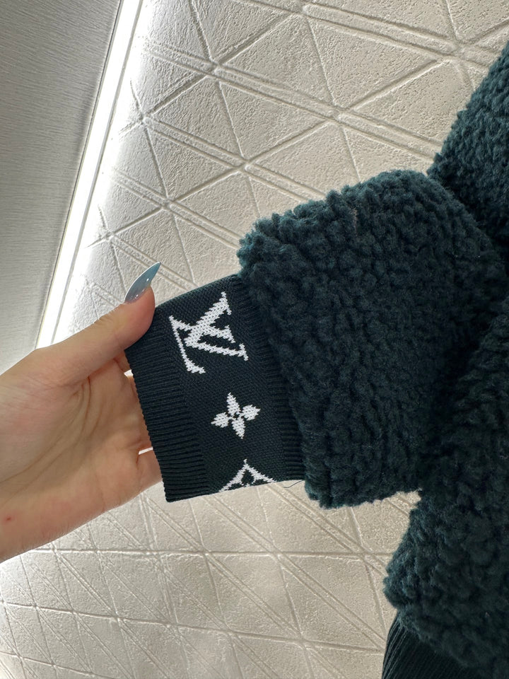 Crafted entirely from teddy plush, this jacket offers a soft, comfortable, and stylish look. The stand-up collar, front zipper, and embossed leather logo on the chest embody the brand's signature style. The lining features a monogram pattern, echoing the lettering on the elastic thread cuffs, showcasing its premium aesthetic. The overall silhouette is crisp and relaxed, with a plush feel. The dark green color exudes a retro vibe, making it a perfect fall and winter outfit choice for layering. Custom fabrics and accessories available. Look for the latest version. 𝑆𝑀𝐿 𝑧𝑝.