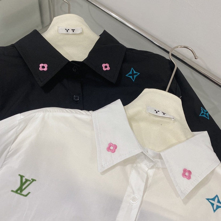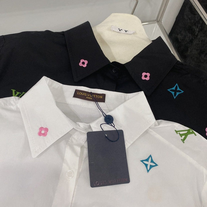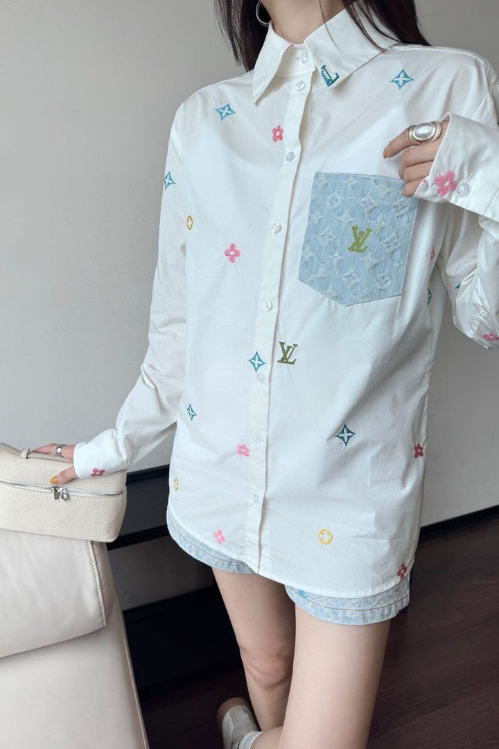 Two-Tone Embroidered Shirts with Denim Pocket Accent
