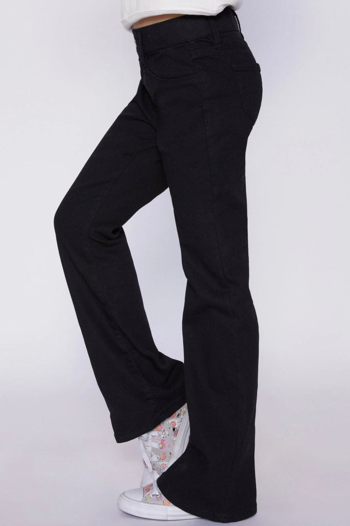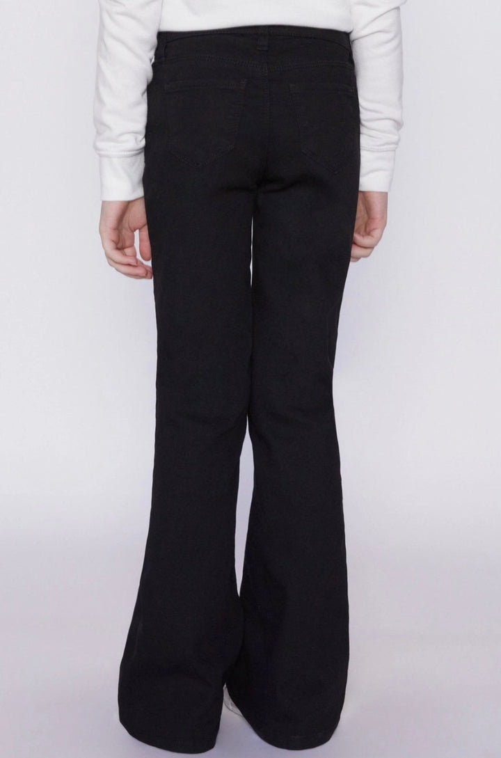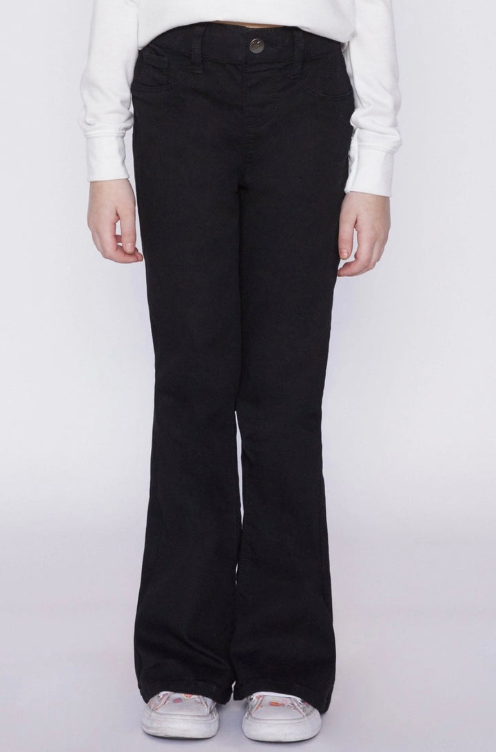 Our girl's pull-on flares featuring faux front pockets, faux single-button closure, functional back pockets, and belt loops. measurement (based on size 10) - inseam: 26” - rise (to top edge of band): 7.5” - leg opening: 18” composition for color Q08: - 67% cotton / 32% polyester / 1% spandex • machine wash cold. • model is wearing a size 08.