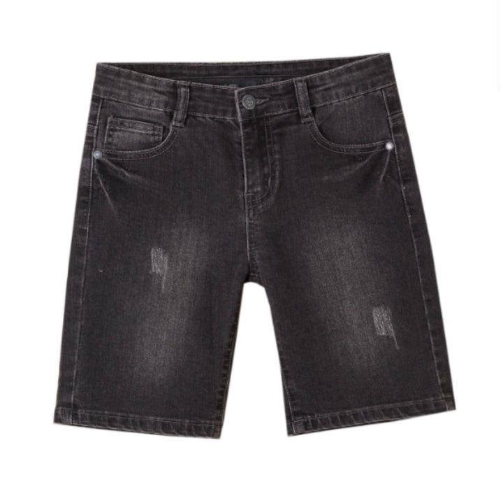 Boys 5 pocket denim shorts in a peppered black color. Built tough for kid play but very comfy.